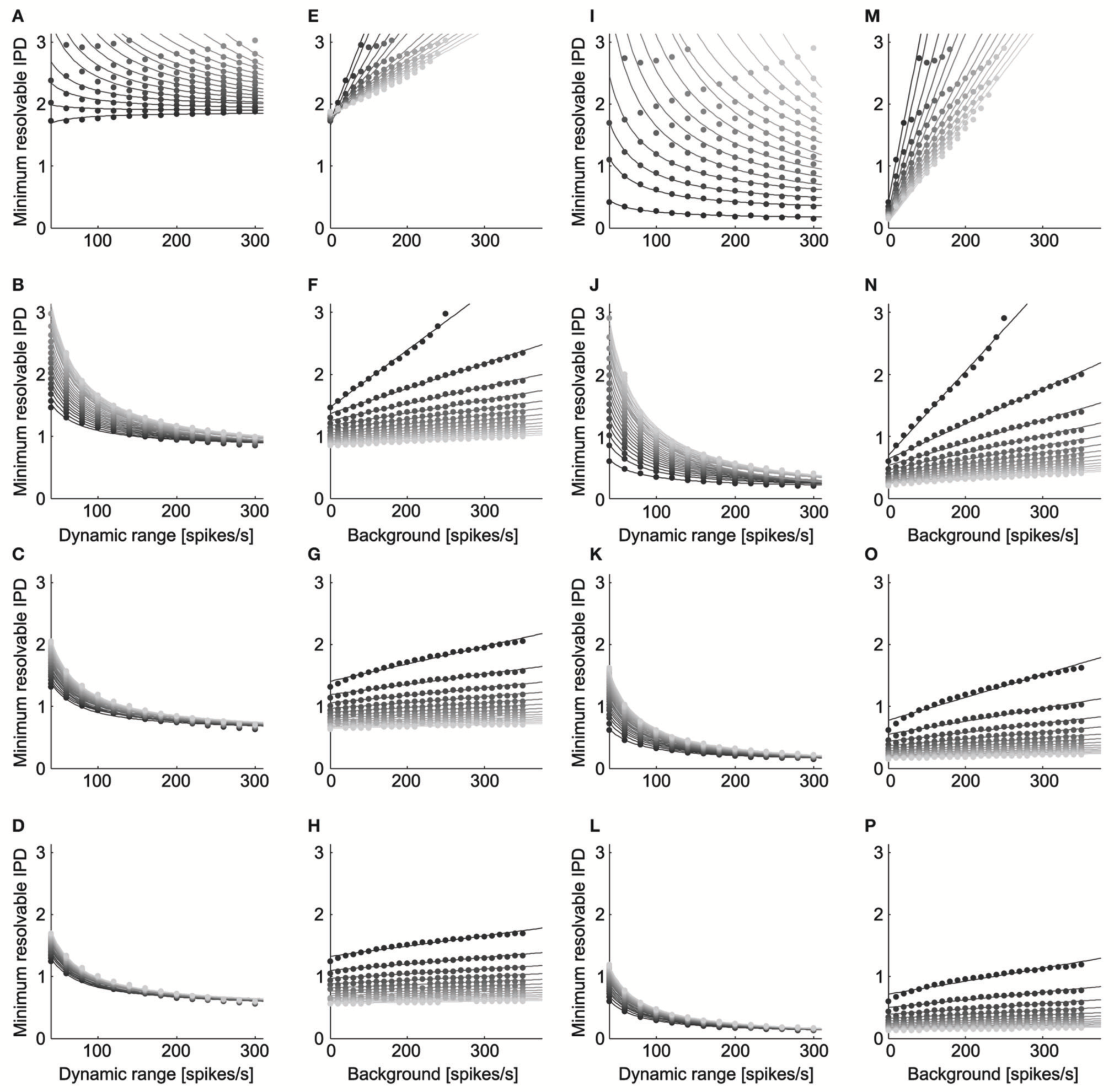 ITD discrimination depends on dynamic range, background rate, and noise. The minimum resolvable IPD varied inversely with the dynamic range ( = c0 + c1/A) for each level of background firing rate and noise exponent (Panels A–D, peak; Panels I–L, slope). The dynamic range is twice the amplitude A. The grayscale in (A–D) and (I–L) codes for the background firing rate, where lighter gray corresponds to higher firing. The noise exponent is constant in each row with k = 1 for the top row, k = 2 for the second row, k = 3 for the third row, and k = 4 for the bottom row. The minimum resolvable IPD increased linearly with the background firing rate ( = c0 + c1B) at each fixed value of the dynamic range and noise exponent (Panels E–H, peak; Panels M–P, slope). The grayscale in (E–H) and (M–P) codes for the dynamic range, where lighter gray corresponds to a larger dynamic range. The minimum resolvable IPD was largest when the firing rate noise was proportional to the mean rate (Panels A,E,I,M) and decreased as the firing rate noise decreased.