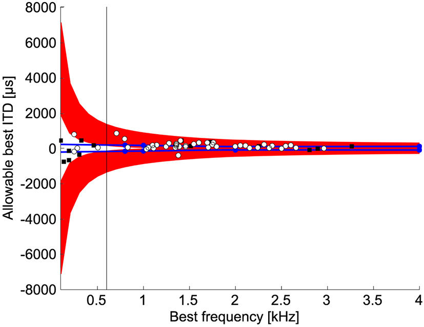 Allowable best ITDs. Allowable best ITDs are those where it is possible to detect a difference between two ITDs using the slope of the ITD tuning curve within the natural range. The red regions show the allowable best ITDs. The blue lines indicate the maximum natural ITD of the chicken (See Methods). Blue dots indicate measurements by Hyson et al. (1994). White dots and black squares show the best ITDs of neurophonic and single unit responses, respectively, in chicken NL (Köppl and Carr, 2008). For frequencies below 600 Hz 92% (11/12) of recorded best ITDs are outside the range of allowable best ITDs.