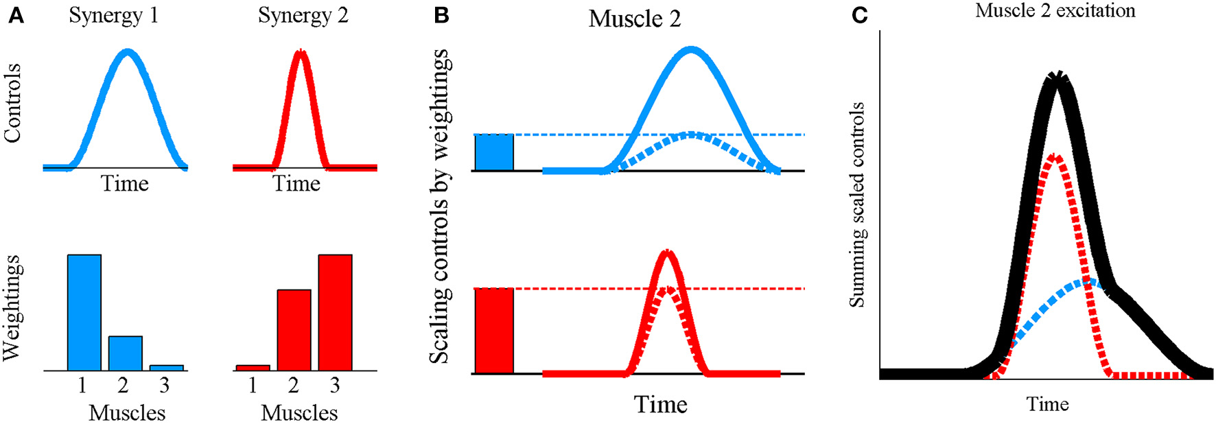 Synergy combination principle for synchronous synergies where (A) the invariant grouping of muscles within the synergy is quantitatively represented by a set of scalar muscle weightings and the co-activation of muscles belonging to a synergy depends on a time-varying control signal. (B) To obtain the excitation profile for muscle 2, each synergy's control signal (continuous lines) is scaled by the weighting for muscle 2 in that synergy (solid bars) obtaining the scaled synergy controls (dashed lines) (C) followed by algebraic summation of the scaled signals (dashed lines) to obtain the muscle excitation (black line). In essence, this is a linear combination process defined by u = ∑W.h where u is a vector of muscle excitations (0 ≤ u ≤ 1), W is a vector of muscle weightings and h is the scalar, instantaneous value of the synergy's control signal. The summation is taken over all synergies.