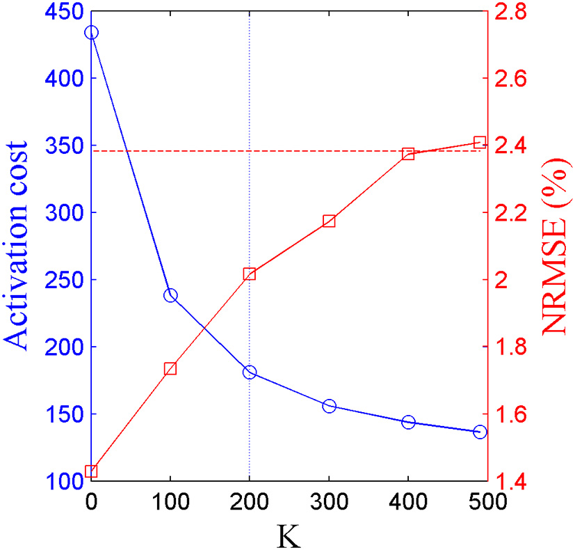 Trends in activation cost (blue circular markers, left y-axis) and NRMSE (red square markers, right y-axis) of optimal-synergy solutions computed with values of K ranging from 0 to 500. The horizontal red dotted line represents the upper limit on NRMSE values while the blue dotted vertical line highlights K = 200 which satisfied the criterion prescribed by ΔK:K+100.