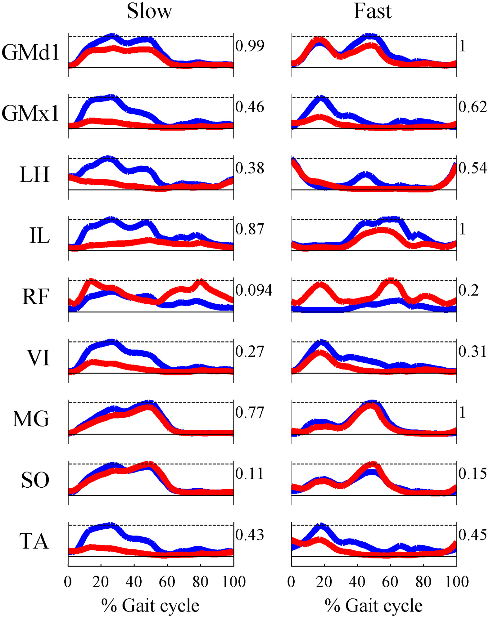 Comparisons of multiple muscle activation patterns at the slow and fast walking speeds, as computed by the pure-synergy (blue line) and optimal-synergy (red line) solutions. The numbers to the right of each plot indicate the peak muscle activation level for that muscle.