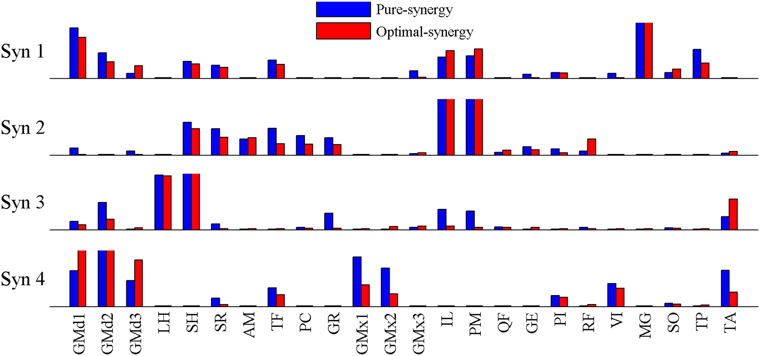 Comparison of muscle weightings for the 4 synergies computed by the optimal-synergy and pure-synergy solutions. For the sake of visual representation, weightings in every synergy (both solutions) were scaled such that the highest weighting value was 1. Synergy controls computed by the two solutions are compared in Figure 8A.
