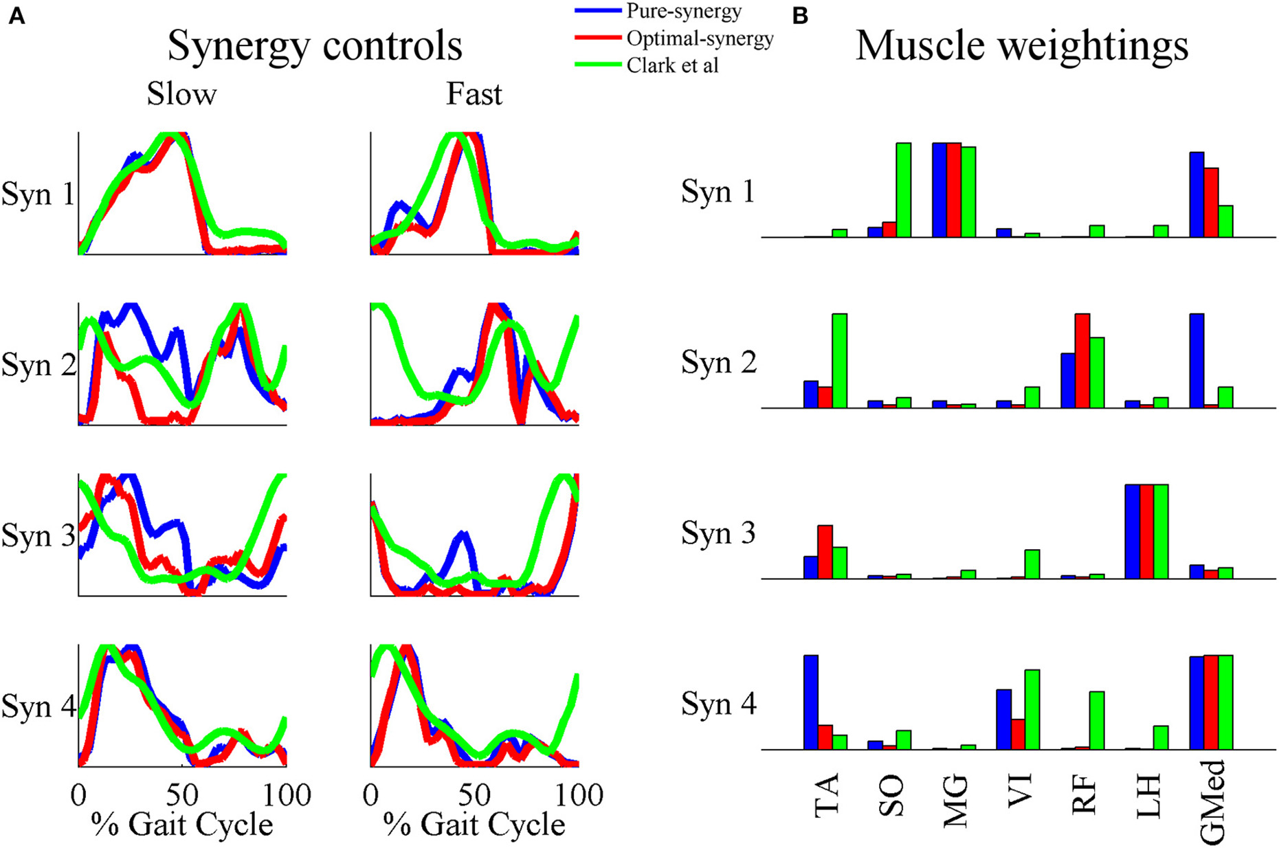 Muscle weightings and synergy controls from the pure-synergy and optimal-synergy solutions were then compared to those obtained from NNMF of experimental EMG and reported in a study by Clark et al. (2010). Correspondent synergies were first identified by using the previously defined similarity index following which synergy controls were compared by computing both individual and mean correlation coefficients. Comparisons of muscle weightings were restricted to those muscles for which EMG was recorded in the study. Synergy controls from Clark et al. for speeds of 0.6 and 1.6 m/s were compared to those at 0.7 and 1.7 m/s in our study.