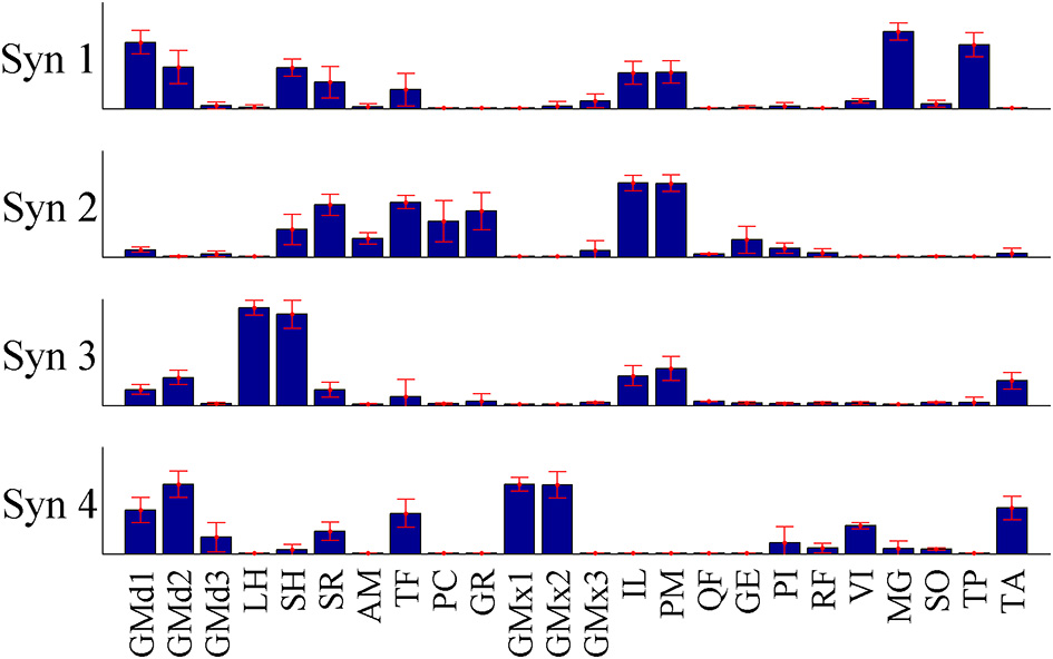 The initial guess for the pure-synergy solution was obtained by first assigning arbitrary muscle excitation patterns to the 24 muscles, over the duration of the three gait cycles at slow and fast walking speeds. These arbitrary excitations consisted of either (a) constant excitation levels over the entire time duration or (b) constant excitations interspersed with sinusoidal pulses. The number of muscles receiving both categories of excitation patterns and the selection of muscles belonging to each category were based on randomly generated integers (“randi” function in MATLAB). The magnitude of the constant excitation levels and the amplitude and timing of the sinusoidal pulses were also randomly assigned (“rand” function in MATLAB). Non-negative matrix factorization (NNMF) was used to decompose these arbitrary excitations into muscle weightings and synergy controls. The pure-synergy solution was repeated using 15 different initial guesses with Nsyn set to a value of 4 synergies. For each such solution, muscle weightings from the four synergies were treated as vectors that were normalized to have a magnitude of 1. This justified the computation of the mean and standard deviation of the muscle weightings from the 15 solutions, which is presented in Figure 9.