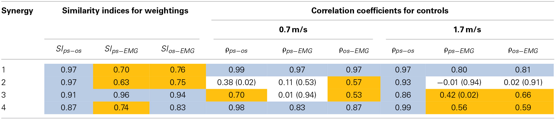 To compare synergies from any two of these three datasets, similarity indices (SI) for muscle weightings and Pearson correlation coefficients (ρ) for synergy controls were computed. When the p-value associated with the correlation was greater than 0.01 (null hypothesis of no correlation), it is reported in parentheses. Other p-values lower than 0.01 indicate high probabilities of the existence of a correlation and have not been explicitly reported in the table. The two datasets which the synergies being compared belonged to are denoted by subscripts; for example SIps−EMG is the synergy-specific similarity index for weightings from the pure-synergy solution and the EMG synergies. Moderate correlations and similarities (0.8 > ρ, SI ≥ 0.5) are highlighted in orange while good ones (1 > ρ, SI ≥ 0.8) are in blue. Low correlations and similarities (ρ, SI <0.5) have been left uncolored.