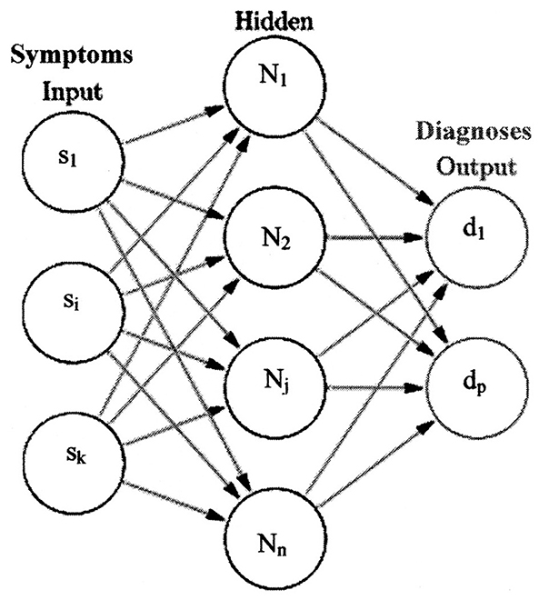 An “si” is a label that associates a textual and/or auditory and/or visual representation of a symptom entered during a neural network's training. Likewise, “di,” is a variable label that associates the choice of representation of a diagnosis entered during a neural network's training. After a representation is entered, the algorithm records this for future retrieval and ascribes the associated binary variable labels.