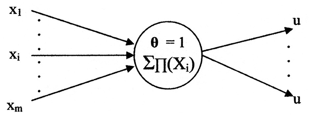 The product of a weight times its associated variables is a “term” of Equation 4. Having a weight (Wp) equal to zero signifies that the term does not appear in a neuron model's threshold equation. For a complete explanation of the Kobylarz-Bradley neuron model template, including a proof that all switching functions can be represented by the template, see Kobylarz and Kobylarz (2023). This property has a far reaching significance. It implies that each switching function output for a neural network can be realized by a single neuron model.
