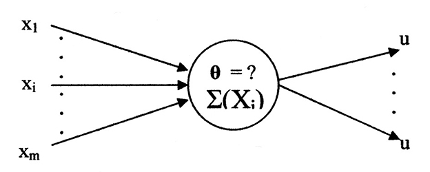 A neuron model, in general, has two functional components (McCulloch and Pitts, 1943). The axonal input and output portions are associated with a switching function, shown as fn({x}). Its variables are binary (digital); i.e., variables possess one of the two per unit values “0” or “1.” The other functional component is an analog threshold function shown as Fn({X}). The two functions interrelate to provide an axonal output, computed according to: