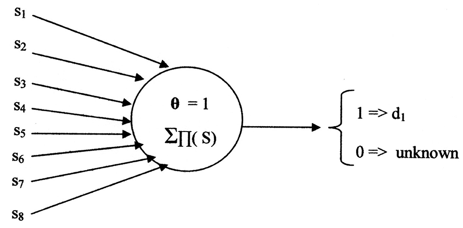 A label convention for variables is adopted within this paper. Lower case variables represent the binary digital axonal inputs/outputs of a neuron model. Upper case letters are used for the neuron model's internal operations. The letter “x” is used as the general neuron model's input. For the symptoms/diagnosis application, the letter “s” is used in lieu of “x” for the neural network's initial input. The letter “d” is used for the neural network's final output. The use of “s” and “d” are intended to emphasize this application of the neural network.
