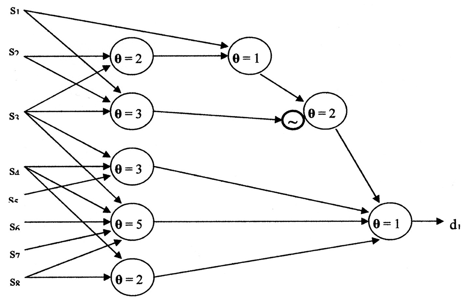 According to Equation 18, when s1 = s2 = s3 = 1, then fn({s}) = 1. However, Equation 20 yields Fr({S}) = −3 < θ. This erroneous result is a consequence of the training sequence used. Rather than establishing an algorithm to properly sequence training steps, a simpler remedy is to run a test of all inputs following training. When an input fails to yield a “1” output, the Affirmation algorithm is performed for the failed input. Likewise, if an input fails to yield a “0” output, the Refutation algorithm is again performed for the failed input. The example's failure implies an Affirmation is needed for the input (s1 s2 s3). Performing Affirmation, for this input, yields the correct threshold function: