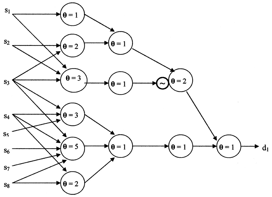 A neural network for Equation 16, using the McCulloch-Pitts neuron model, is shown in Figure 8. When θ = 1, the McCulloch-Pitts neuron model performs a logical “Or” function. The logical “And” function is performed by the McCulloch-Pitts neuron model when θ ≥ 2. The circle enclosing “~” represents an inhibitory synapse (logical negation).
