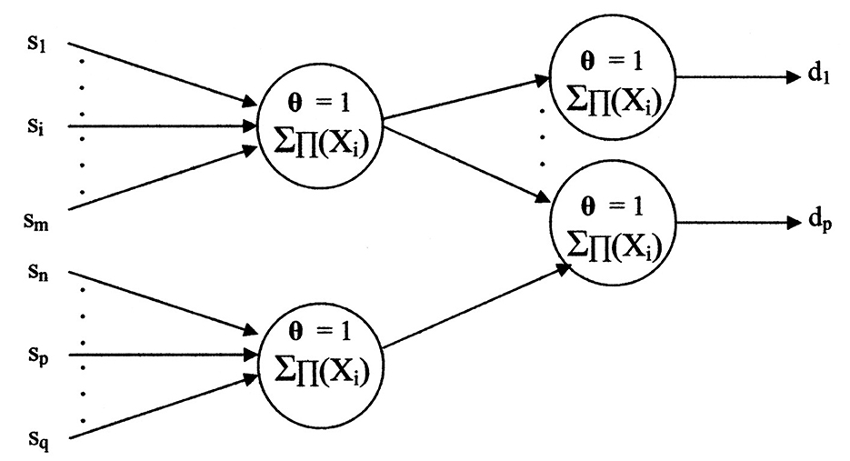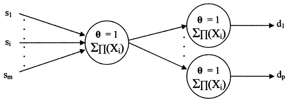 The training input/output set pairs “({s1, …, sm}, {d1, …, dp})” imply a primitive neural network. As shown in Figure 10, only peripheral neuron models occur from execution of the algorithms.
