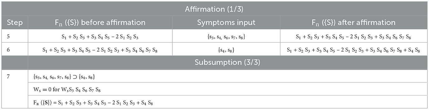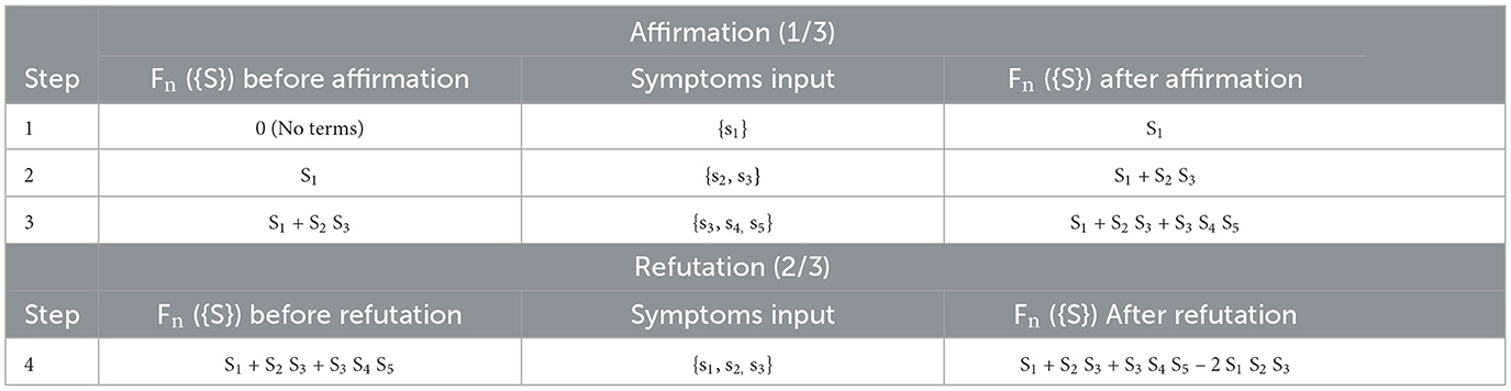 An example deploying these three algorithms will now be provided by the use of tables. Because symptoms are the example inputs, the symbols “{S}” and “{s}” will be used. Consecutive rows of a table represent the sequence of symptom “{s}” inputs, which are identified in the middle column. The column to the left presents the threshold function “Fn({S})” prior to applying an input “{s}.” The column to the right presents the threshold function “Fn({S})” after applying an input “{s}.” Table 2 has two sections corresponding to the first two algorithms. It represents the beginning of training. The training input sequence begins with Affirmation. Having Affirmation precede Refutation is important because the affirmed set needs determination to be refuted.