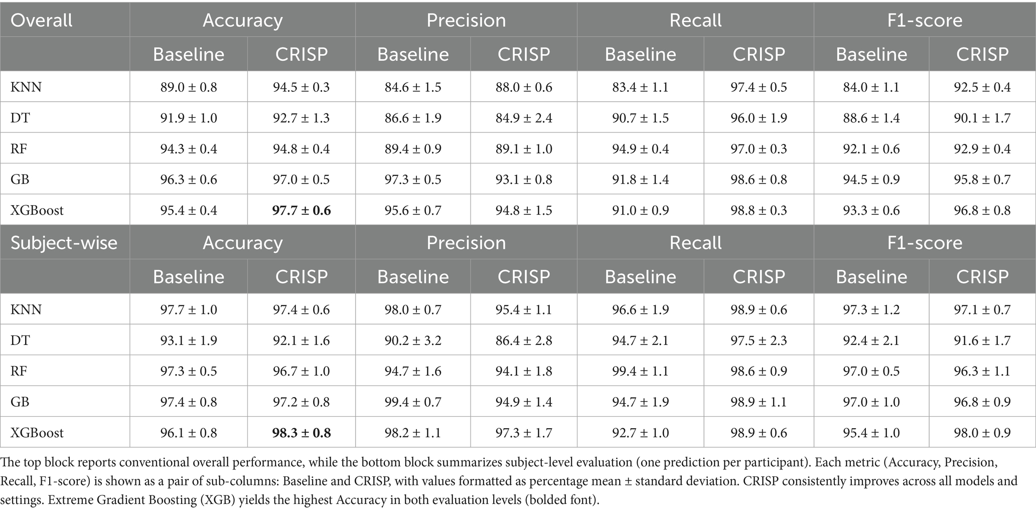 Table 1 reports the average classification metrics achieved by each of the five models under both evaluation schemes. Across the board, CRISP consistently outperformed the baseline configuration, yielding gains in accuracy, precision, recall, and F1-score. Under the overall protocol, where cycle-level predictions were aggregated regardless of subject origin, XGBoost achieved the highest mean accuracy of 97.7%, closely followed by Random Forest (97.1%) and Gradient Boosting (96.9%). The precision-recall balance was particularly strong for ensemble-based models, indicating that CRISP not only improved raw detection rates but also minimized false alarms and missed cases across heterogeneous gait cycles. In the more clinically relevant subject-wise protocol, which aggregates predictions at the patient level to simulate real-world deployment, CRISP continued to deliver robust improvements. XGBoost’s subject-level accuracy improved from 96.1% (baseline) to 98.3% (CRISP), with F1-score and specificity also showing upward trends. Other classifiers, including Gradient Boosting and Random Forest, followed a similar pattern of enhanced subject-wise generalization. This consistency highlights the pipeline’s effectiveness in supporting patient-level diagnostic decisions rather than merely optimizing cycle-level performance. For a full breakdown of metrics and fold-level variance, refer to Supplementary Tables S1–S4.