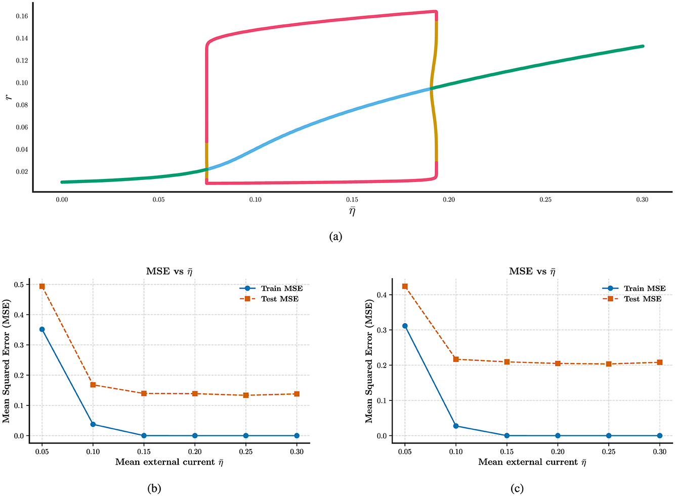 Figure 1. Identification of suitable external current for neural computation. (a) The bifurcation of the firing rate for the mean-field with mean external current . Green, blue, red, and mustard curves represent stable fixed points, unstable fixed points, stable limit cycles, and unstable limit cycles, respectively. (b) and (c) Training and testing MSE as a function of mean external current for different target functions y1(t)andy2(t).