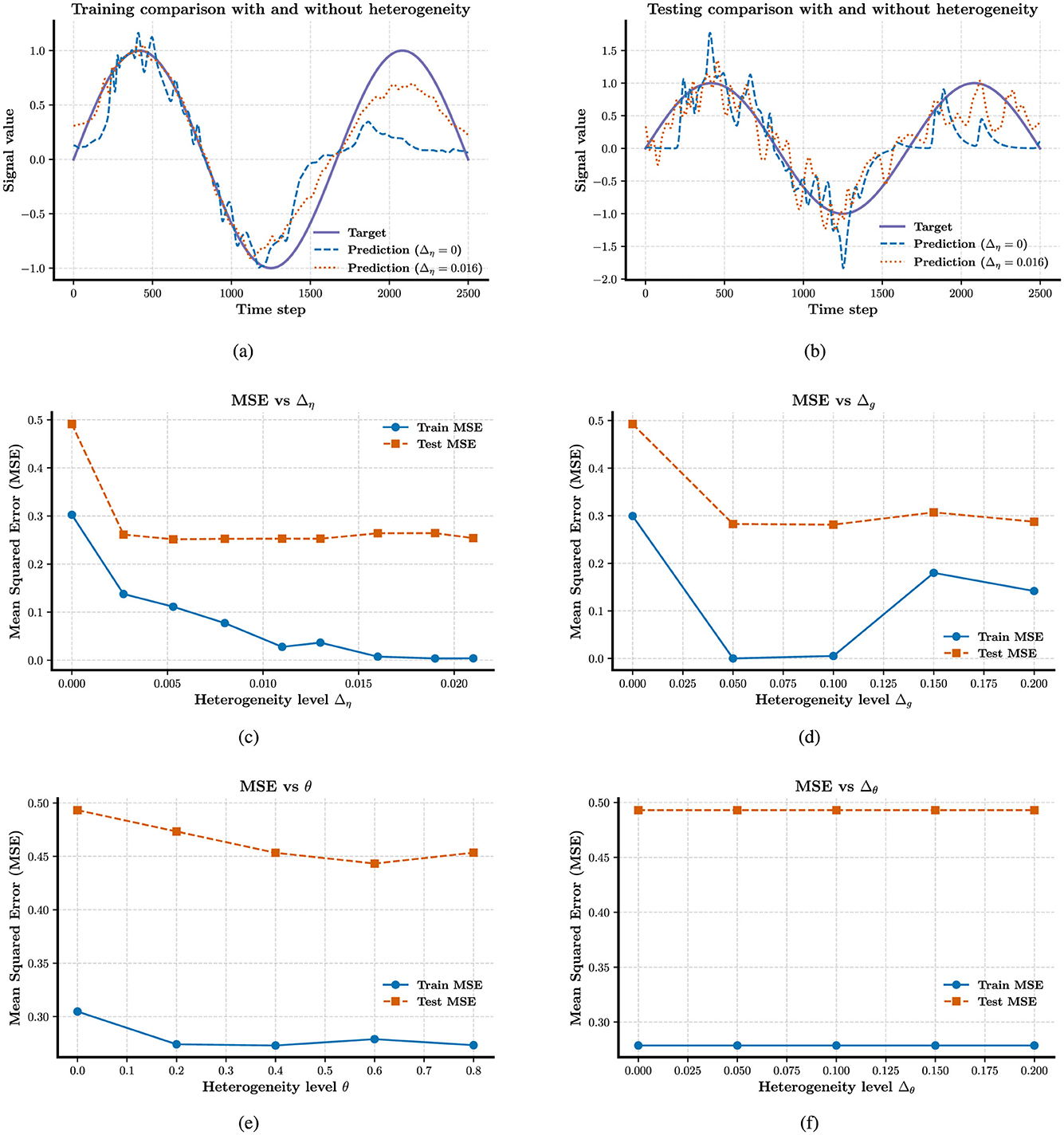 Figure 2. Enhancing the stability of neural computation using RLS in the presence of heterogeneity. (a) and (b) Shown are the curve fitting results on training and test datasets under conditions with and without external current heterogeneity. (c–e) Results about the MSE on both training and test sets varies as a function of external, network, and intrinsic heterogeneity. (f) MSE on training and test sets as a function of partial reset coefficient heterogeneity. All plots show mean MSE values across 50 trials, with standard deviations omitted for clarity.