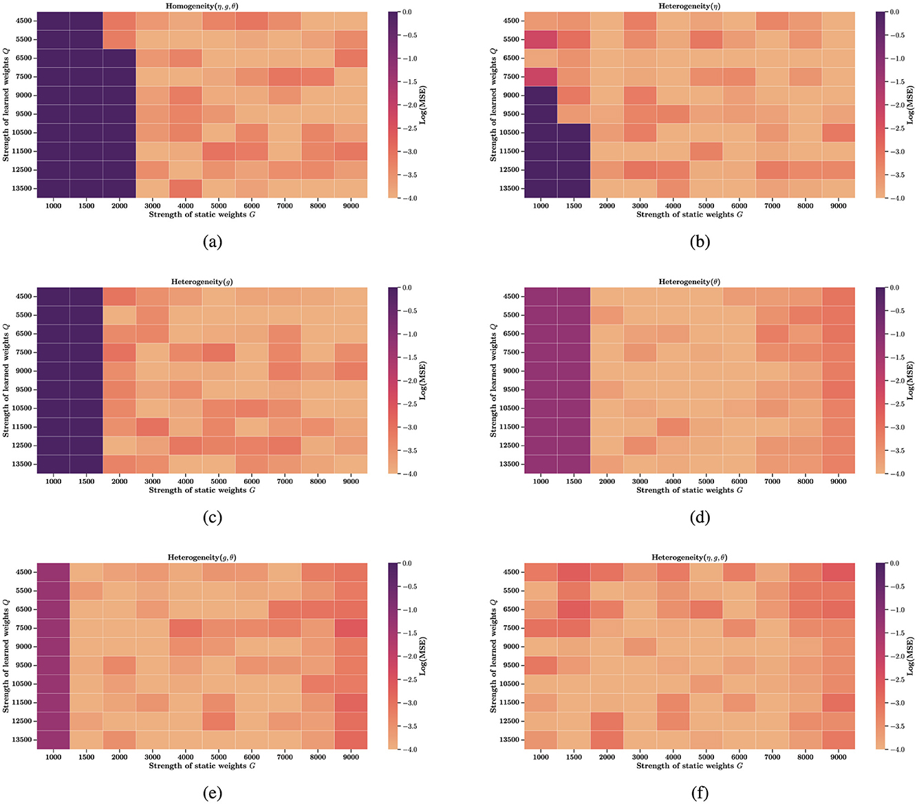 Figure 4. Heatmap of reconstruction error across learning hyperparameters. Each panel shows the log-scaled mean squared error (log(MSE)) as a function of learning hyperparameters G and Q. Dark purple regions (log(MSE) > 0) indicate failure to accurately reconstruct the target signal, while lighter regions represent higher computational precision. (a) Homogeneous network (no heterogeneity). (b) External input heterogeneity. (c) Network heterogeneity (e.g., synaptic variability). (d) Intrinsic neuronal heterogeneity. (e) Combined network and intrinsic heterogeneity. (f) Full heterogeneity: external, network, and intrinsic. All colorbars represent log(MSE).