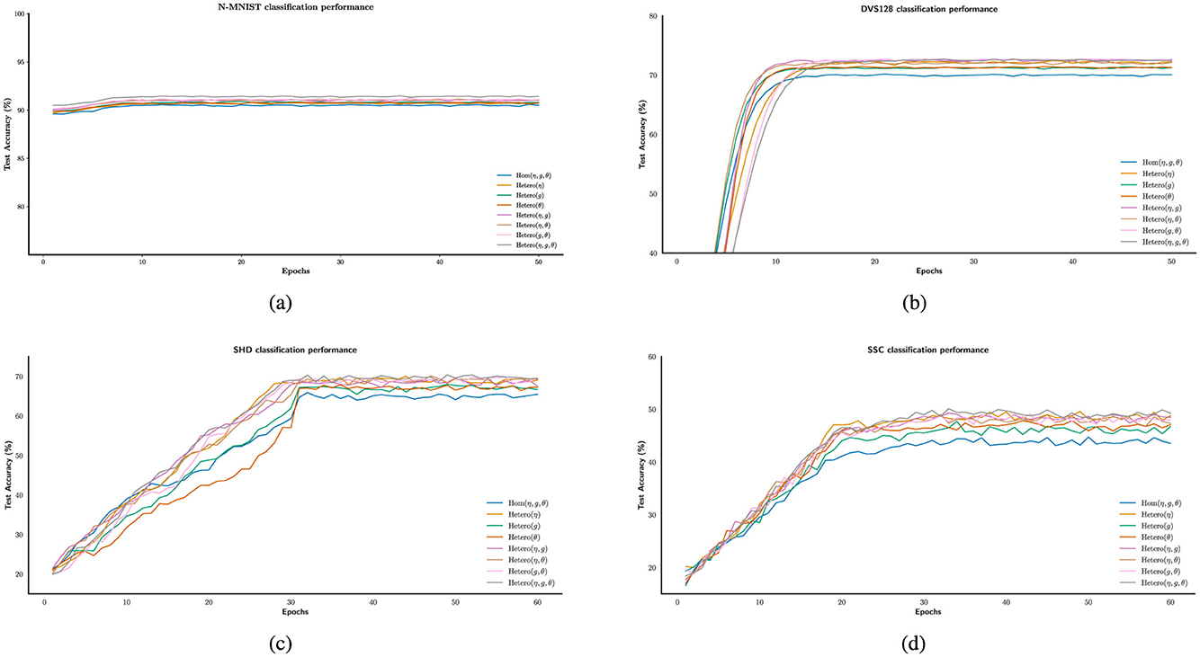 We systematically investigated how neural heterogeneity influences task performance by training SNNs to approximate both simple and complex temporal dynamics. However, SNNs have also found applications in diverse domains such as image classification (Huang et al., 2023; Li et al., 2023) and speech recognition (Liu et al., 2023; Song et al., 2022). To further assess the impact of neural heterogeneity on task performance, we evaluated its influence on the ability of SNNs to classify both visual and auditory stimuli. We employ four benchmark datasets with varying degrees of temporal complexity: Neuromorphic MNIST (N-MNIST) and the DVS128 Gesture dataset for visual tasks, and the Spiking Heidelberg Digits (SHD) and Spiking Speech Commands (SSC) datasets for auditory tasks (see Appendix C for details). While many existing studies use the Leaky Integrate-and-Fire (LIF) model as the neuronal substrate (Wu and Maass, 2025; Shen et al., 2025), we adopt the Izhikevich (IK) model in our experiments due to its richer biological realism (Fitz et al., 2020; Dur-e Ahmad et al., 2012). Previous research has also shown that the IK model can achieve superior performance in certain contexts (Izhikevich, 2007; Izhikevich and Edelman, 2008). Additionally, using the same neural model as in Sections A and B ensures consistency throughout our study.