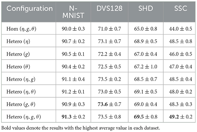 The test results across datasets reveal that heterogeneity plays a significant role in neural computation, contributing to improved computational accuracy. Notably, the combination of multiple forms of heterogeneity tends to exert a stronger facilitative effect. However, increasing the number of heterogeneous parameters does not necessarily lead to proportional performance gains. In several cases, similar accuracies were achieved with different numbers of heterogeneous components. For instance, on the SSC dataset, independent heterogeneity in parameter η yielded the same accuracy improvement as the joint heterogeneity of (η, g). This suggests that while heterogeneity is generally beneficial, the contribution of each source is not uniform. On the SHD dataset, we even observed that independent heterogeneity in η outperformed the combined heterogeneity of (η, g), indicating that multiple sources of heterogeneity do not always act synergistically. These findings highlight the need for careful consideration when selecting between single or combined forms of heterogeneity in neural computation models.