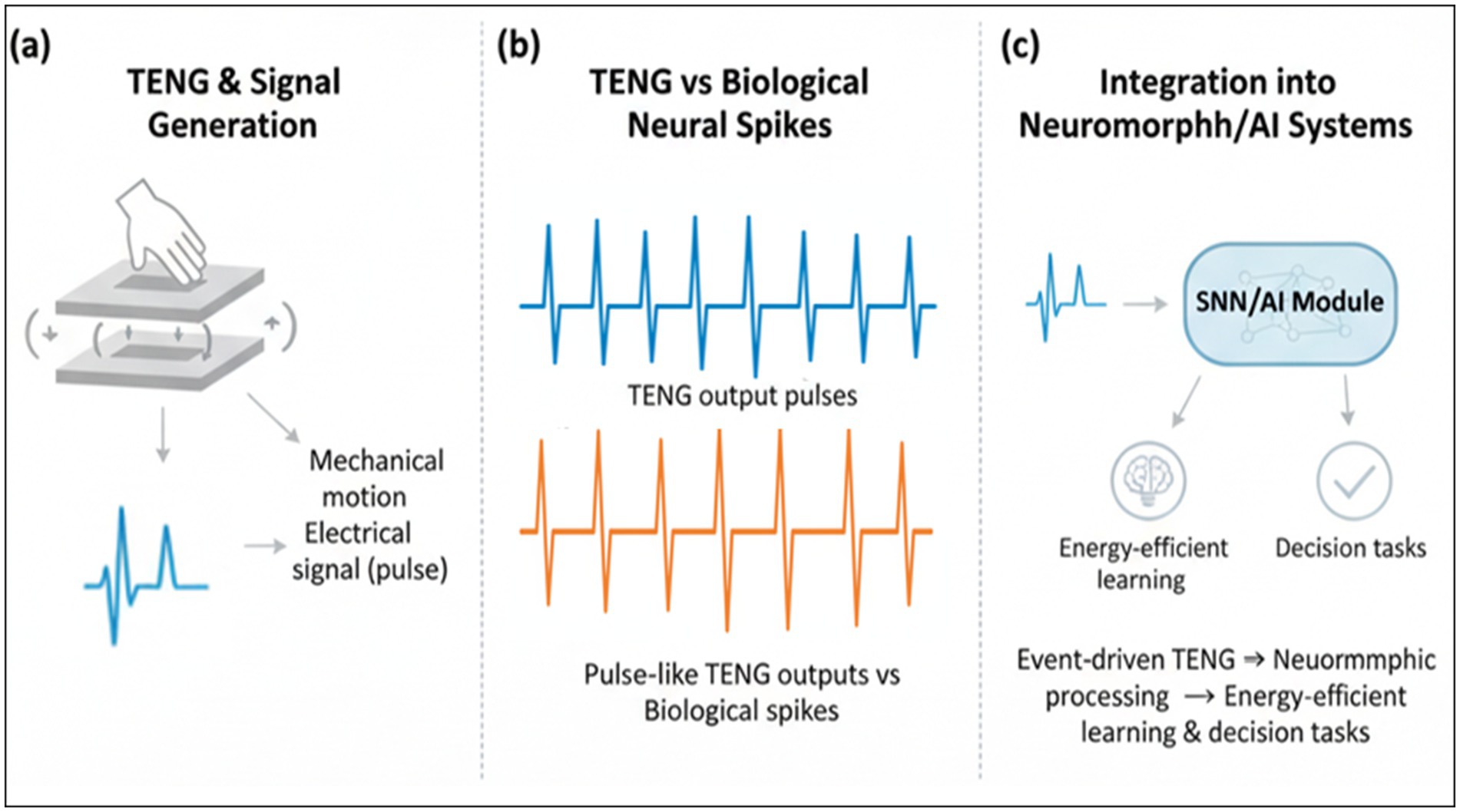 Beyond traditional deep learning, the field is moving toward more biologically inspired models. Spiking neural networks (SNNs) and neuromorphic hardware architectures offer an event-driven, energy-efficient computational paradigm (Nasr et al., 2021) that naturally aligns with the sparse and discrete nature of both biological neural signals and TENG sensor outputs (Lin et al., 2020). This synergy promises a new generation of ultra-low-power biomedical devices capable of sophisticated on-device data processing (He and Lee, 2021; Koo et al., 2020) (Figure 2 illustrates how TENG-generated pulse-like signals can be seamlessly mapped into neuromorphic frameworks for event-driven computation).
