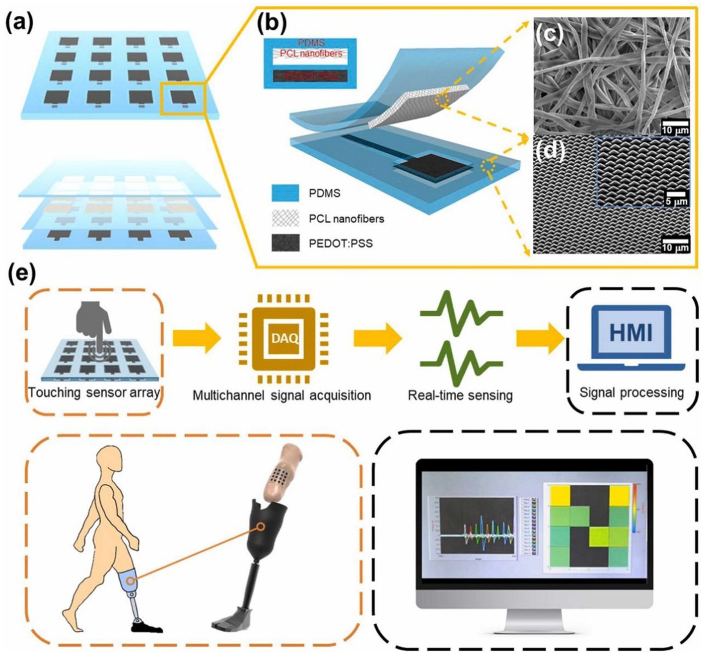 Figure 3. (a) Schematic diagram of the tactile sensor array system. (b) Cross-sectional layered view of the tactile sensor based on PDMS, PCL nanofiber membrane, and PEDOT electrodes. (c) SEM image of the PCL nanofiber membrane. (d) SEM image of the pyramid-patterned PDMS layer. (e) Schematic diagram of the integration of the tactile sensor array system with a multi-channel data acquisition system and a relative pixel representation of the pressure distribution inside the prosthetic socket displayed on the HMI system.