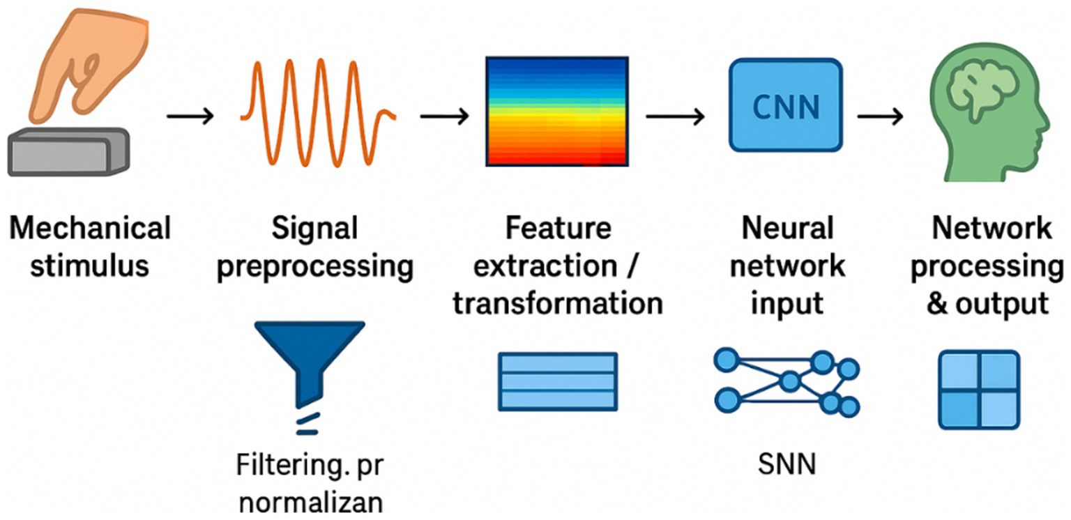 In this mini-review, we examine the pivotal role of TENG-based sensing in computational neuroscience (Wu et al., 2020; Zhang et al., 2021) and discuss how its convergence with deep learning and neuromorphic paradigms can profoundly enhance neural data interpretation (Nasr et al., 2021; Lin et al., 2020). We highlight current progress in developing these integrated systems (Meng et al., 2023; Wu et al., 2021), outline key challenges related to signal fidelity, system integration, and data analysis (Brunner, 2023; Lu et al., 2023), and present a forward-looking perspective for the future integration of TENGs into advanced neural monitoring and brain–computer interface applications (He and Lee, 2021; Wang et al., 2022). To make this perspective accessible across disciplines, Figure 2 provides a conceptual overview linking TENG signal generation, preprocessing, and downstream AI-driven interpretation pathways. Beyond elderly healthcare, TENG–AI systems have also demonstrated potential in diverse domains such as intelligent prosthetics, athletic performance monitoring, environmental sensing, and soft robotic perception.