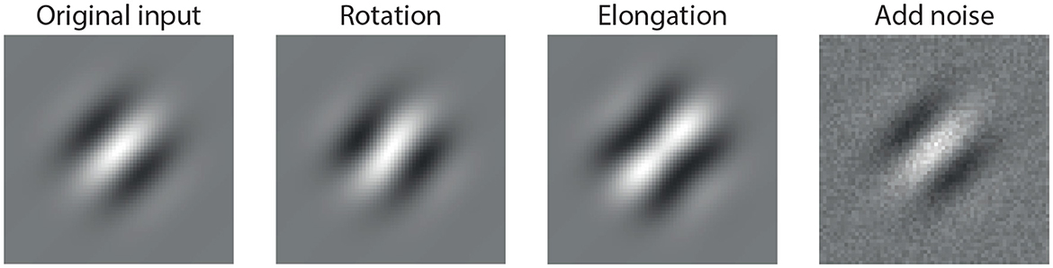 Figure 1. Example of perturbations applied to a standard Gabor stimulus: (1) original input, (2) rotated version (orientation change), (3) elongated version (spatial shape change), and (4) noise-added version (random perturbation). While all three perturbations are small in magnitude, only the first two induce semantically meaningful changes in the stimulus, which a robust visual system should prioritize. The last perturbation, although visually subtle, is semantically irrelevant and ideally should be suppressed.