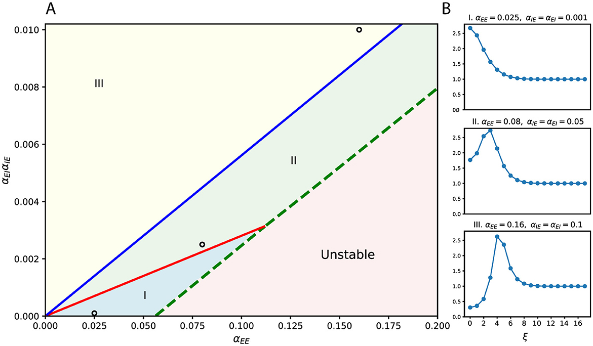 Figure 2. Frequency-selective effects of lateral connectivity. (A) Phase diagram over connection strengths, with αEE on the horizontal axis and αEIαIE on the vertical axis. The diagram is divided into three stable regions (I–III) and one unstable region, separated by critical lines. Example parameter choices are marked by circles. (B) Frequency (ξ) response curves corresponding to the marked parameters in (A). Different regions of the phase diagram produce qualitatively distinct filtering profiles. Here, the widths of lateral connections are fixed and equal (σEE = σEI = σIE = 10).