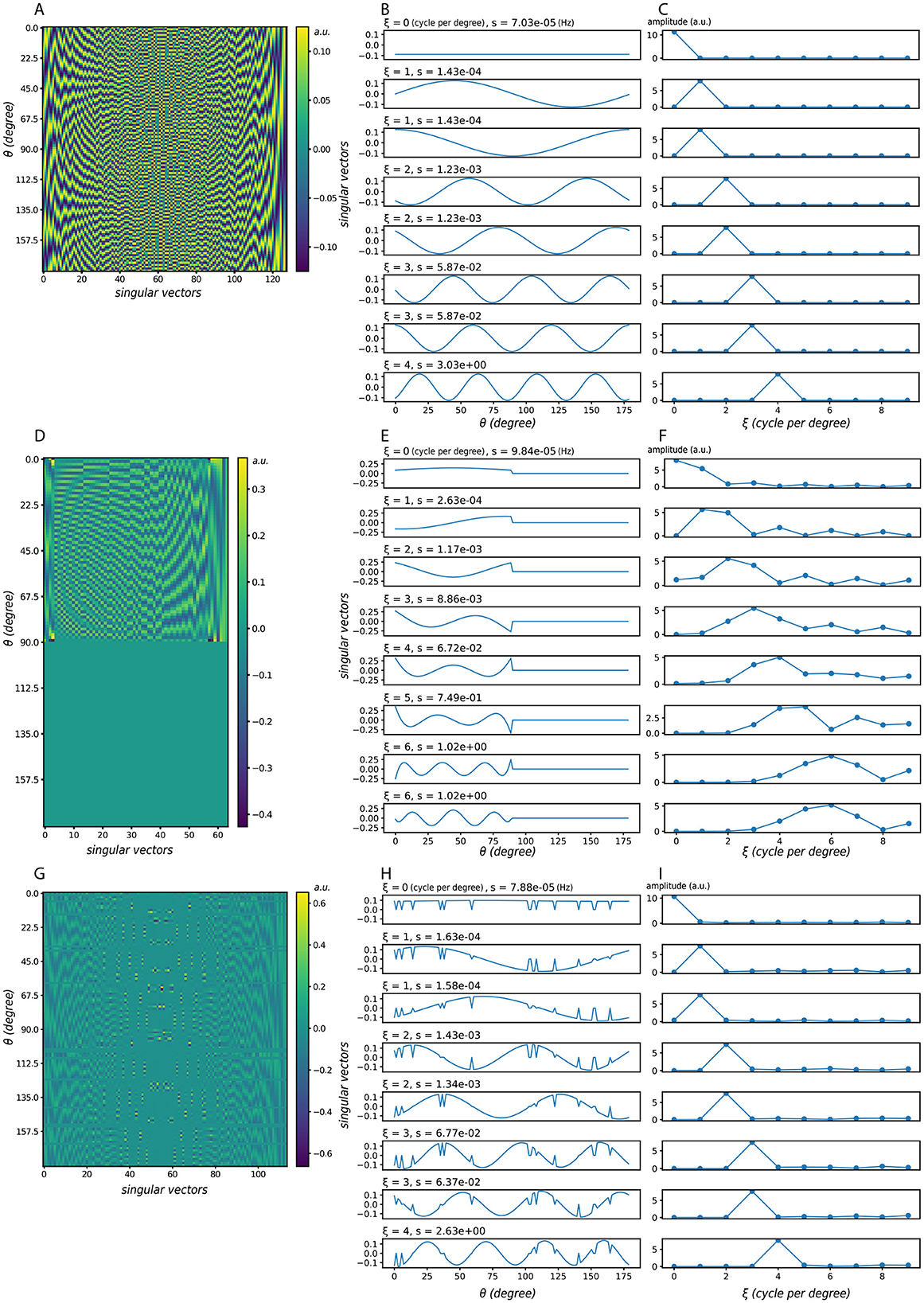 Figure 3. Singular vectors under different activation patterns. (A–C) All neurons are active. (D–F) Half of the neurons are active in succession. (G–I) Random neuron loss, where each neuron is silenced independently with probability 0.1. In each case: (left) singular vector matrices, where each column corresponds to one singular vector, ordered by decreasing singular value s; (middle) the same singular vectors plotted in orientation space, but reordered according to their dominant frequency ξ; (right) corresponding frequency-domain representations, where the peak indicates the dominant frequency and its height reflects the strength of that component. Here ξ denotes the dominant frequency of each singular vector, and s the corresponding singular value (amplification factor). Despite partial deactivation, the dominant frequency components remain visible, showing that the system's preference for frequency-dominant perturbations is robust to neuron loss. Model parameters: σEE = σEI = σIE = 24, αEE = 4, αEI = αIE = 2.