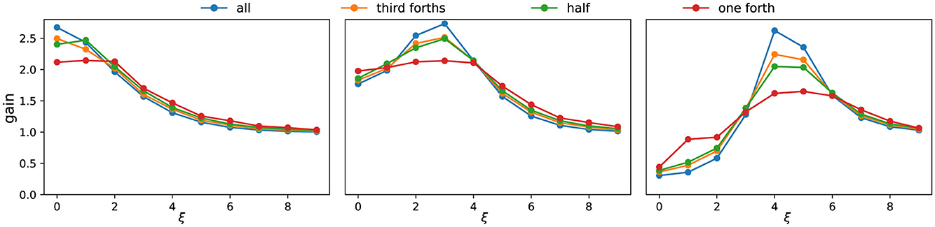 Figure 4. Frequency response curves under different activation patterns. Each subpanel corresponds to one parameter setting (same as Figure 2B). Colors indicate different fractions of consecutively active neurons. The x-axis denotes the dominant frequency ξ of the singular vectors, while the y-axis shows the corresponding singular value s. As the proportion of active neurons decreases, the frequency response curve becomes smoother, reflecting weaker frequency selectivity.