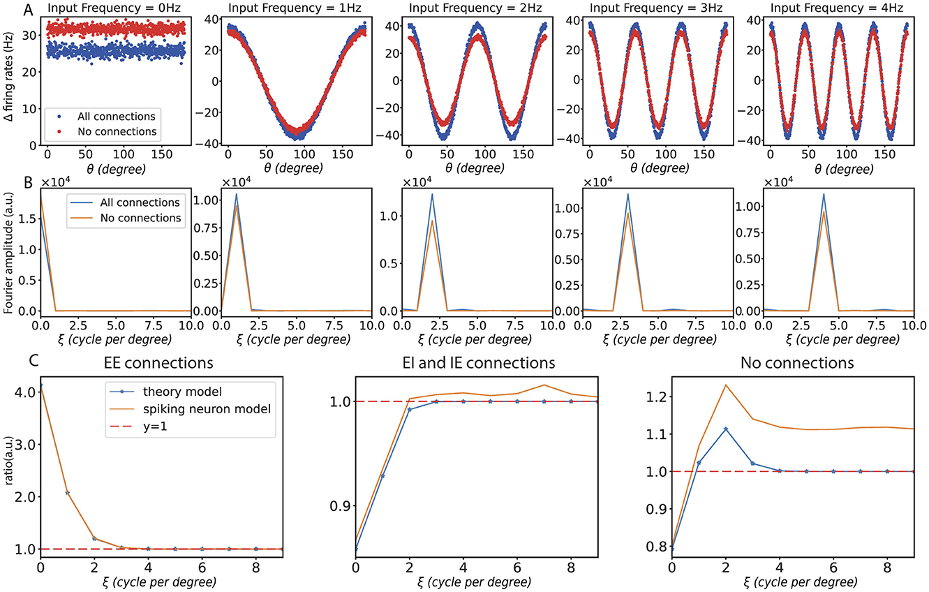 First, we demonstrate the response of different frequency perturbations in orientation space and frequency space for unconnected and fully connected networks, as shown in Figures 5A, B. Then, we present experimental results in the mean-driven regime. Consistent with the steady-state rate model, the spiking neuron model in the mean-driven regime also demonstrates a preference for different frequencies. This quantitative consistency could be achieved by considering a dimensionful mapping from the dimensionless steady-state rate model to the dimensionful spiking neuron model. As shown in Figure 5C, when no connections were present, the ring model responded uniformly to all frequencies. With only recurrent excitatory connections, the ring model enhanced the low-frequency response. In contrast, when only recurrent inhibitory connections were present, the ring model suppressed the low-frequency response. And when recurrent excitatory and inhibitory connections were present, the model demonstrated a preference for a specific frequency.