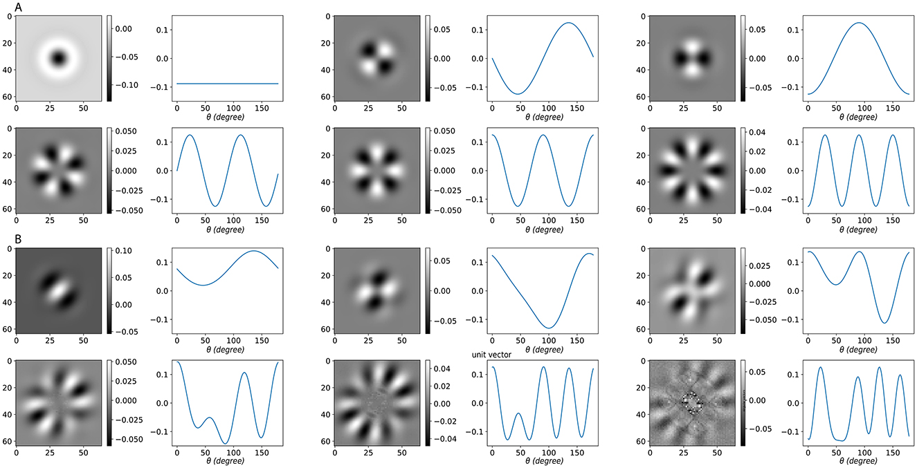 Figure 6. SVD of the Gabor operator under different activation conditions. (A) Fully active case. Because each orientation channel is a rotated copy of the same kernel, the Gabor operator is approximately block-circulant along the orientation. Its left singular vectors U (orientation domain) align with discrete Fourier modes (sinusoids over orientation), shown as waveforms, while the paired right singular vectors V (image domain) are reshaped into grayscale image patterns. The x-axis of these waveforms denotes the orientation angle θ, and the y-axis indicates the relative weight of each singular vector across orientation channels. In this symmetric setting, no directional bias appears; the organizing index is the orientation frequency ξ. (B) Partially active case with a contiguous active sector. Restricting to a subset of active orientations breaks circular symmetry and introduces directional preference. The leading singular vectors remain frequency-dominant but become biased toward the active sector. Low-order frequencies correspond to familiar image-level perturbations: ξ = 0 represents contrast modulation; ξ = 1 corresponds to a small rotation (odd, shift-like); and ξ = 2 corresponds to elongation or aspect-ratio change (even, two-lobe). Each image tile shows the right singular vector V (image-space pattern), with the paired left singular vector U plotted as a sinusoid over orientation. Here, ξ denotes the dominant orientation frequency of the singular vector (DFT index).