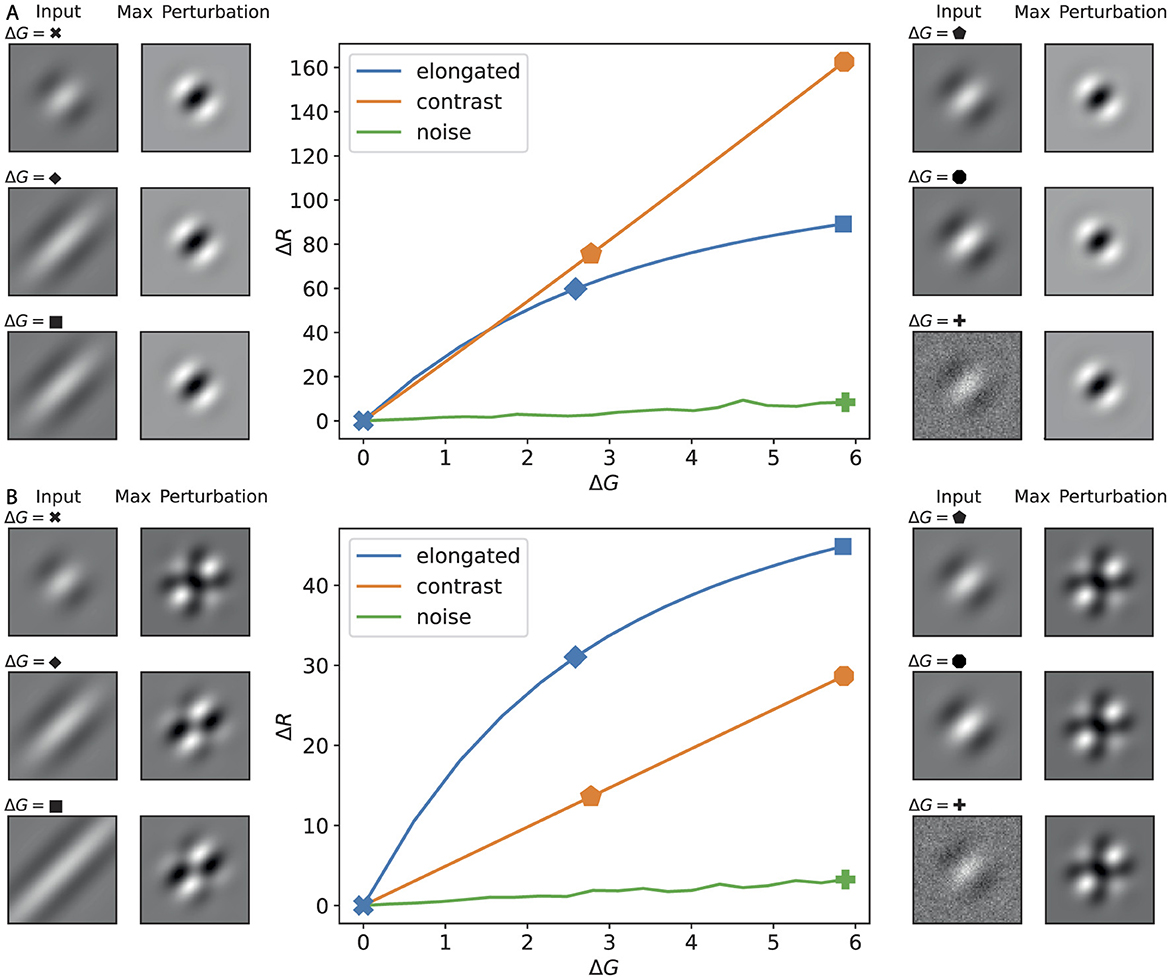 Figure 8. Response functions (ΔR vs. ΔG) for canonical image perturbations, with examples at selected amplitudes. (A) Disconnected lateral connections; (B) fully connected regime (cf. Figure 2). Center plots show the change in ring response ΔR versus input amplitude ΔG for three perturbation families: elongation (blue), contrast scaling (orange), and Gaussian noise (green). Side thumbnails illustrate, for selected amplitudes (indicated by symbols on the curves), the input image (left) and the maximizing perturbation pattern for that input (right).