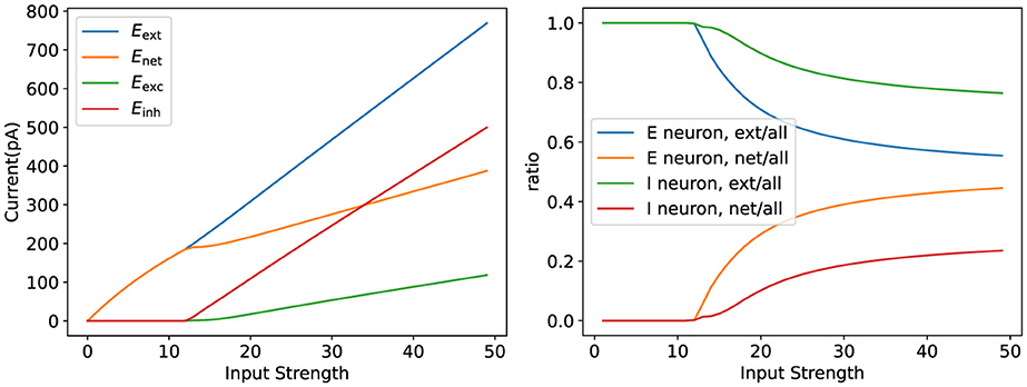 Figure 9. Validation of parameter rationality. The figure on the left illustrates the variation of the network current as the input strength varies. The figure on the right shows the internal network current versus the external input current as a percentage of the total network current.