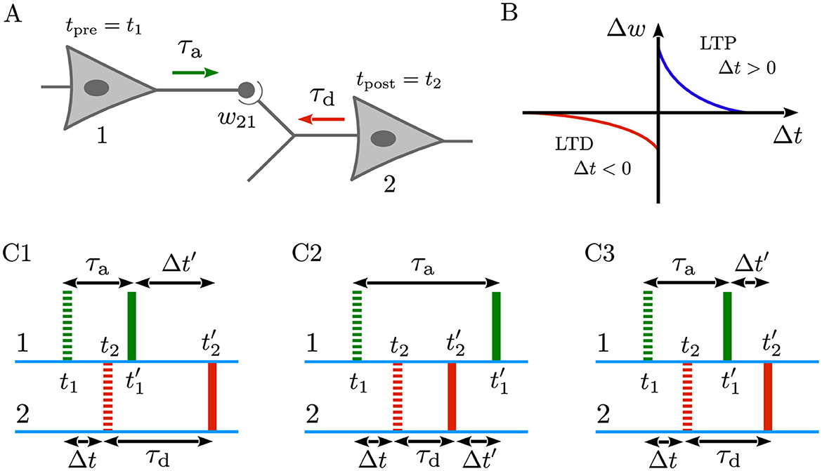 As illustrated in Figure 1A, consider that the presynaptic neuron (1) is connected to the postsynaptic neuron (2), characterized by the coupling weight w21. If the presynaptic neuron fires at tpre = t1 and the postsynaptic neuron fires at tpost = t2, both the forward signal propagated along the presynaptic axon (denoted by the green arrow) and the backward signal backpropagated through the dendrite of the postsynaptic neuron (denoted by the red arrow) are essential for inducing synaptic modifications in the form of LTD or LTP (also see Figure 1B) (Sjöström and Häusser, 2006; Clopath and Gerstner, 2010; Froemke et al., 2010). However, when delays are taken into account, the spike times arriving at the synapse (Figures 1C1–C3, solid markers) may significantly differ from those initiated at the cell bodies (Figures 1C1–C3, dashed markers), depending on the trade-off between dendritic and axonal delays. Specifically, as shown in Figures 1C1–C3, when a presynaptic spike is generated at t1, it must first travel down the axon before reaching the synapse, thus arriving at , where τa is the axonal delay. By the same token, a postsynaptic spike generated at t2 must backpropagate through the dendrite before arriving at the synapse at , where τd is the dendritic delay. Consequently, this delay-induced time shift in spikes arrival may significantly affect the outcome of timing-dependent learning paradigms such as STDP (Gerstner et al., 1993; Senn et al., 2002; Morrison et al., 2008; Madadi Asl et al., 2017), as discussed below.