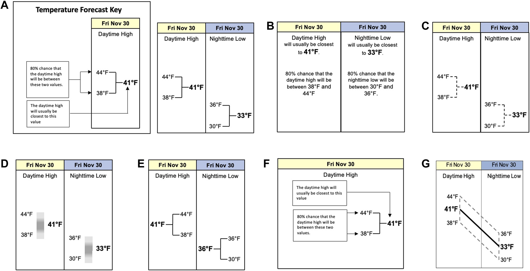 Predictive intervals, each accompanied by a key (shown in a) describing “41°F” as the “best forecast”. Note: Font and figure sizes are slightly smaller than they were in the original experiments to conform to journal requirements.