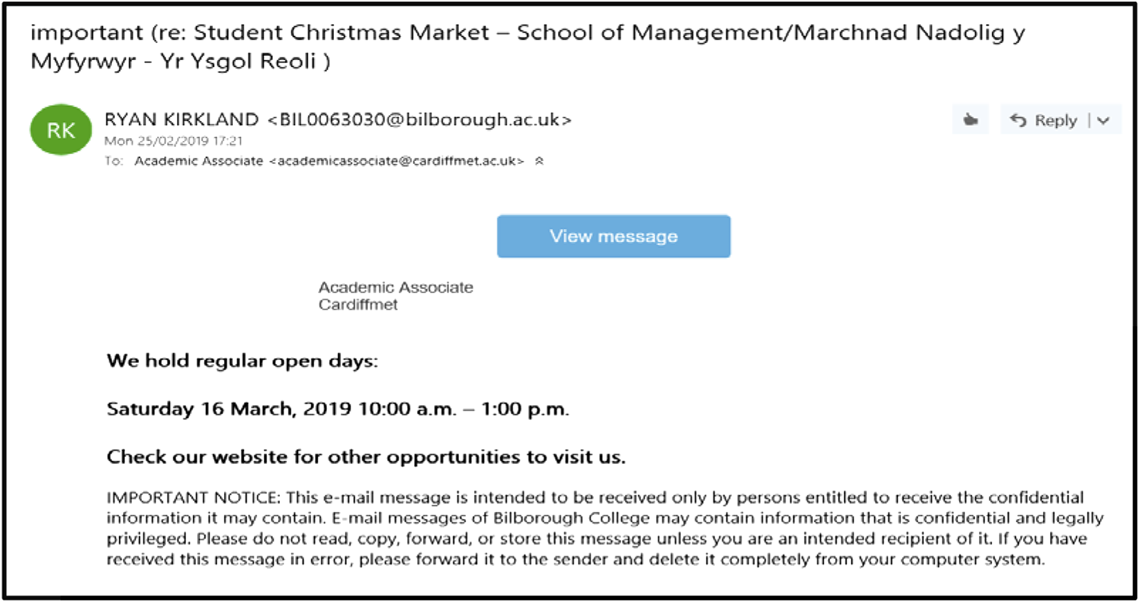 Some real-world examples of phishing attacks are discussed in this section to present the complexity of some recent phishing attacks. Figure 2 shows the screenshot of a suspicious phishing email that passed a University’s spam filters and reached the recipient mailbox. As shown in Figure 2, the phisher uses the sense of importance or urgency in the subject through the word ‘important,’ so that the email can trigger a psychological reaction in the user to prompt them into clicking the button “View message.” The email contains a suspicious embedded button, indeed, when hovering over this embedded button, it does not match with Uniform Resource Locator (URL) in the status bar. Another clue in this example is that the sender's address is questionable and not known to the receiver. Clicking on the fake attachment button will result in either installation of a virus or worm onto the computer or handing over the user’s credentials by redirecting the victim onto a fake login page.