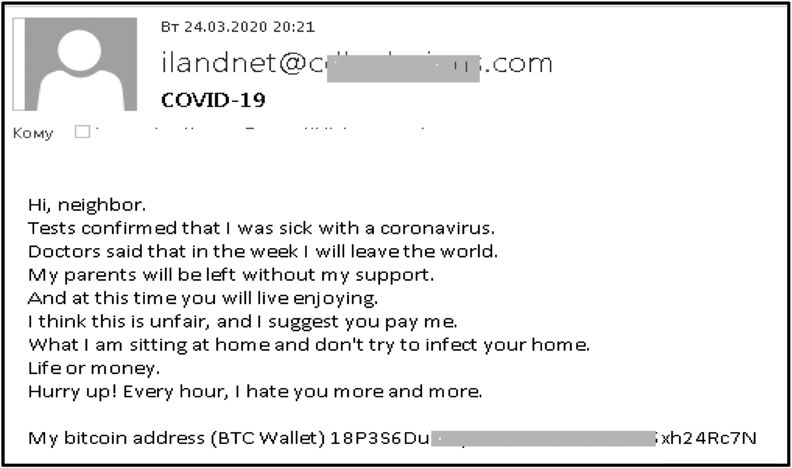 Figure 3 shows an example of a phishing e-mail where the attacker claimed to be the recipient’s neighbor sending a message in which they pretended to be dying from the virus and threatening to infect the victim unless a ransom was paid (Ksepersky, 2020).