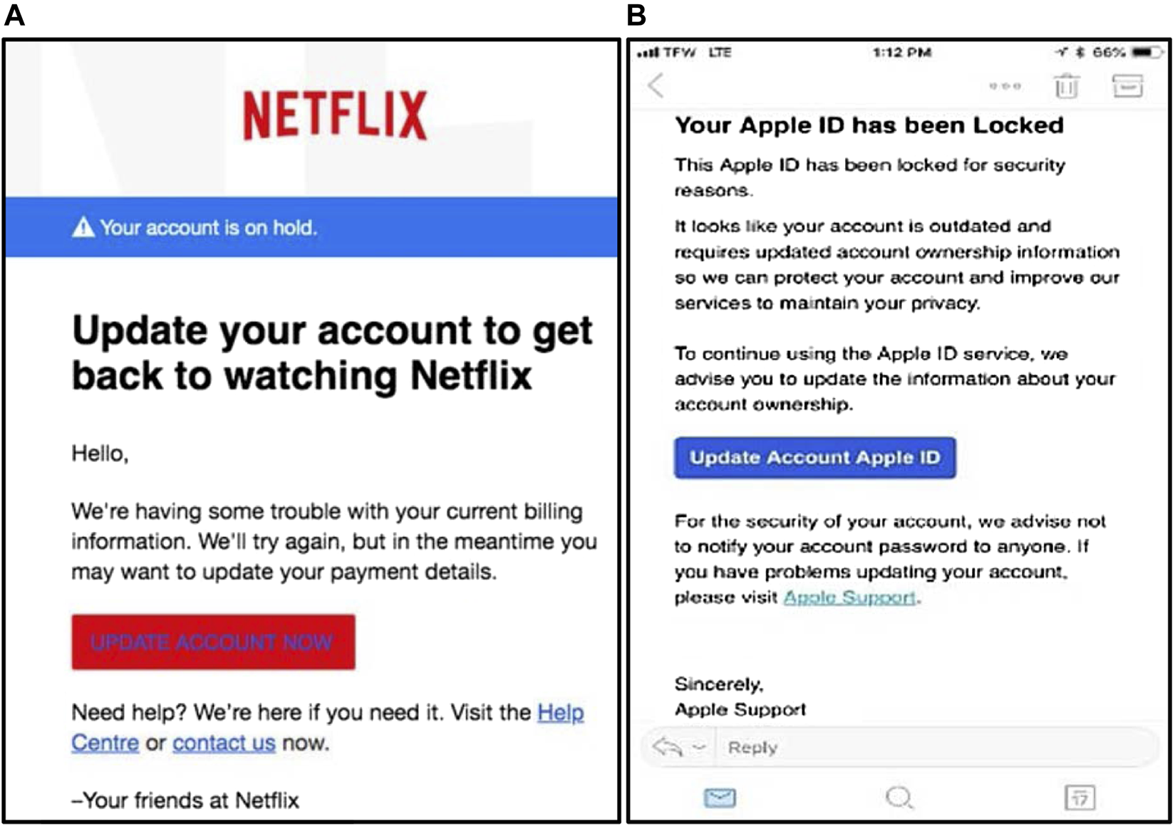 Screenshot of the (A) Netflix scam email and (B) fraudulent text message (Apple) (Keck, 2018; Rhett, 2019)