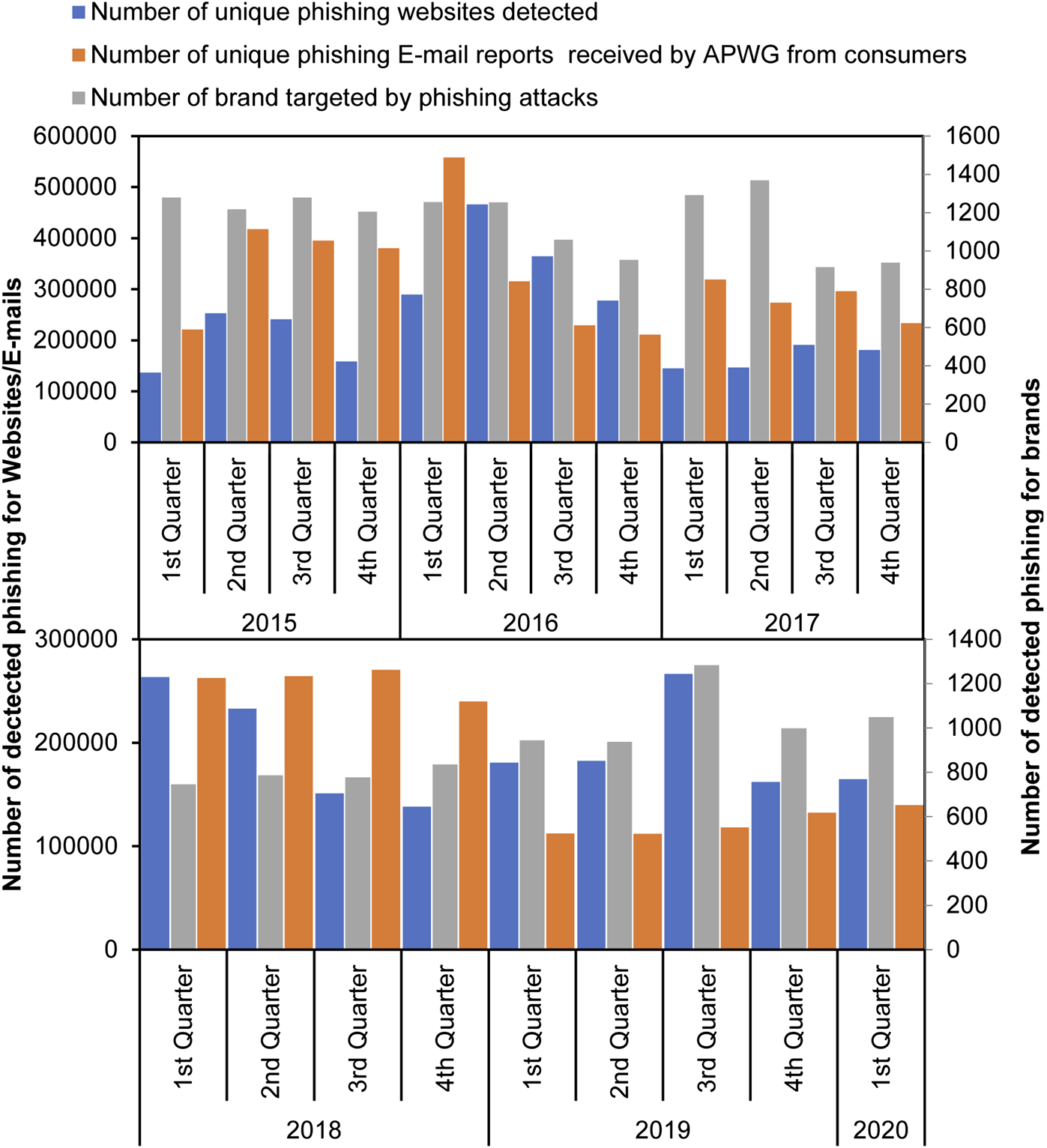 The APWG Phishing Activity Trends Report analyzes and measures the evolution, proliferation, and propagation of phishing attacks reported to the APWG. Figure 5 shows the growth in phishing attacks from 2015 to 2020 by quarters based on APWG annual reports (APWG, 2020). As demonstrated in Figure 5, in the third quarter of 2019, the number of phishing attacks rose to 266,387, which is the highest level in three years since late 2016. This was up 46% from the 182,465 for the second quarter, and almost double the 138,328 seen in the fourth quarter of 2018. The number of unique phishing e-mails reported to APWG in the same quarter was 118,260. Furthermore, it was found that the number of brands targeted by phishing campaigns was 1,283.