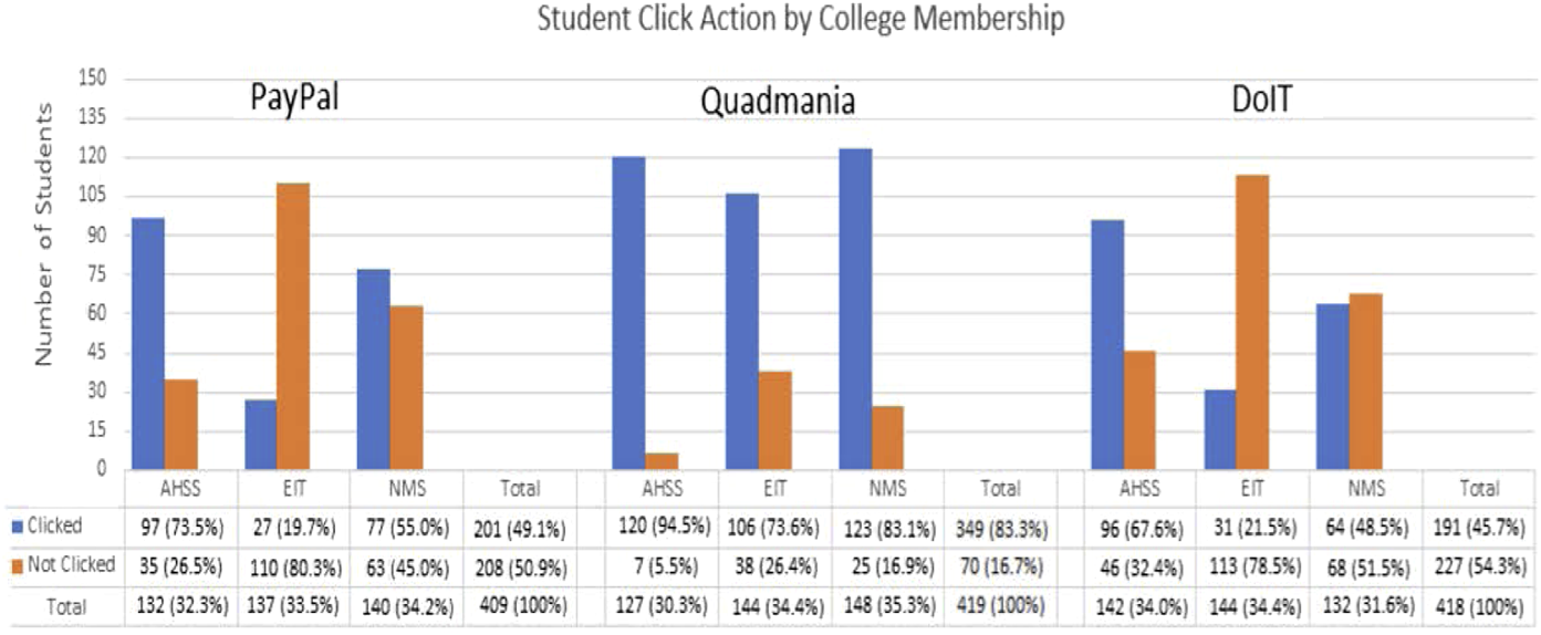 The number of clicks on phishing emails by students in the College of Arts, Humanities, and Social Sciences (AHSS), the College of Engineering and Information Technology (EIT), and the College of Natural and Mathematical Sciences (NMS) at the University of Maryland, Baltimore County (UMBC) (Diaz et al., 2020).