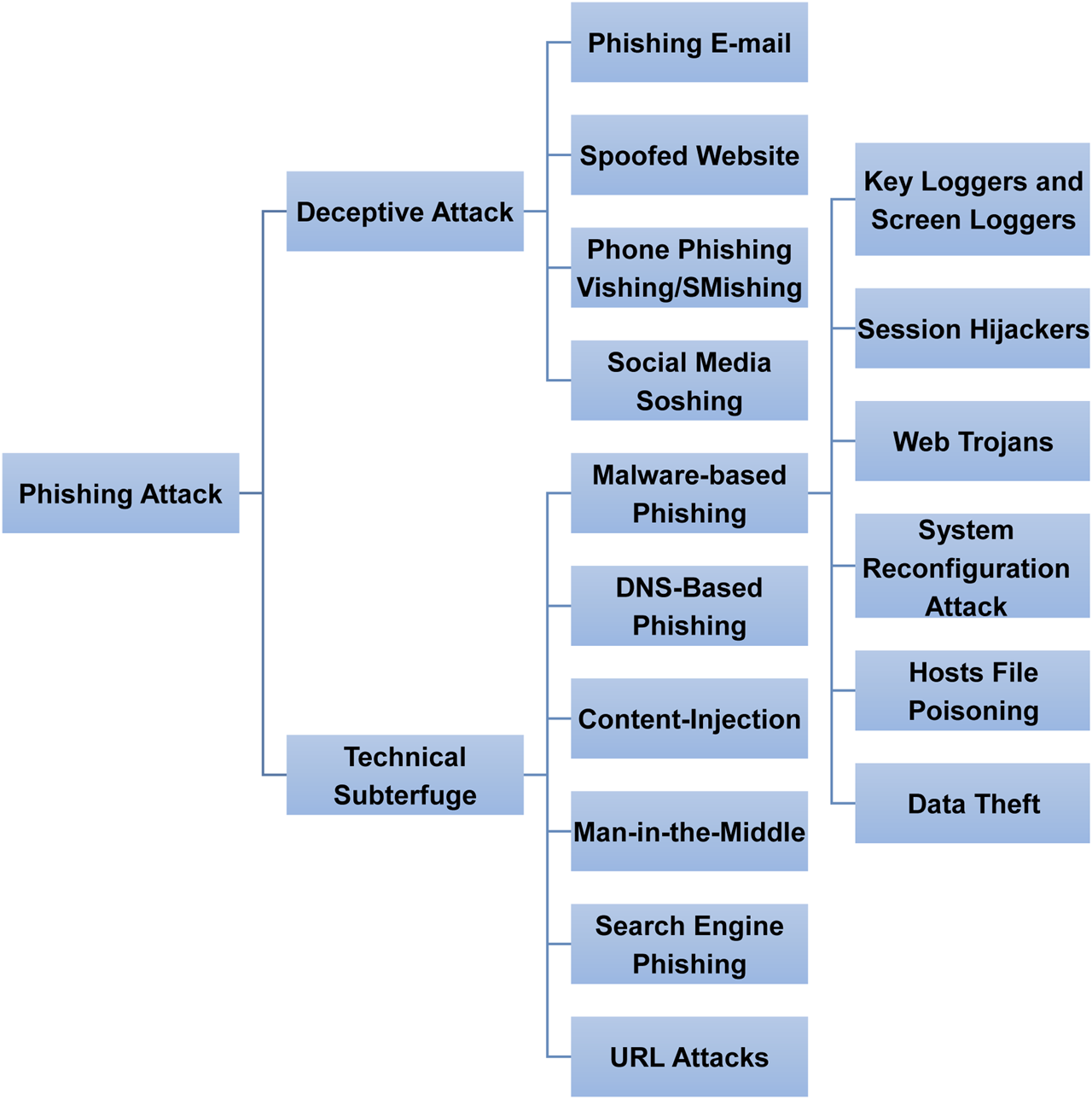 Cybersecurity has been a major concern since the beginning of APRANET, which is considered to be the first wide-area packet-switching network with distributed control and one of the first networks to implement the TCP/IP protocol suite. The term “Phishing” which was also called carding or brand spoofing, was coined for the first time in 1996 when the hackers created randomized credit card numbers using an algorithm to steal users' passwords from America Online (AOL) (Whitman and Mattord, 2012; Cui et al., 2017). Then phishers used instant messages or emails to reach users by posing as AOL employees to convince users to reveal their passwords. Attackers believed that requesting customers to update their account would be an effective way to disclose their sensitive information, thereafter, phishers started to target larger financial companies. The author in (Ollmann, 2004) believes that the “ph” in phishing comes from the terminology “Phreaks” which was coined by John Draper, who was also known as Captain Crunch, and was used by early Internet criminals when they phreak telephone systems. Where the “f” in ‘fishing’ replaced with “ph” in “Phishing” as they both have the same meaning by phishing the passwords and sensitive information from the sea of internet users. Over time, phishers developed various and more advanced types of scams for launching their attack. Sometimes, the purpose of the attack is not limited to stealing sensitive information, but it could involve injecting viruses or downloading the malicious program into a victim's computer. Phishers make use of a trusted source (for instance a bank helpdesk) to deceive victims so that they disclose their sensitive information (Ollmann, 2004).