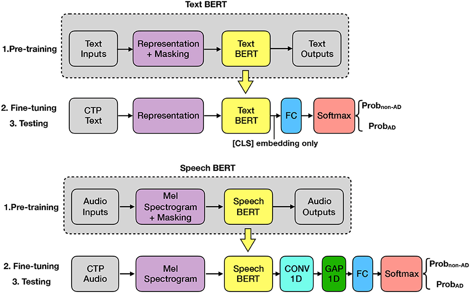 While the supervised classification approach utilizes labeled datasets, self-supervised learning approaches take advantage of unlabeled datasets for pre-training. The removal of the labeling requirement enables the model to extract knowledge from an extended range of data sources, e.g., digital books, Wikipedia, and online news. We propose a Text BERT model and a Speech BERT model for AD classification, as shown in Figure 2.