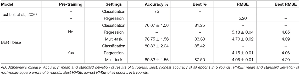 We evaluated a regression model and a multi-task transfer learning model using BERT base. As shown in Table 5, when using BERT base without pre-training, the multi-task transfer learning model outperformed the single-task models, i.e., the classification accuracy is increased from 76.67 to 78.75%, and the RMSE decreased from 5.18 to 4.70. The evaluation results confirmed that the two tasks help each other to achieve a better performance, especially when both single-task models have room to be improved. In comparison, when using BERT base with pre-training, the multi-task transfer learning model introduced limited performance gain in classification and introduced a negative impact in the regression model. Specifically, the average classification accuracy remained the same at 80.83%, the standard deviation decreased from 2.04 to 1.56%, and Best accuracy is increased from 85.42 to 87.50%, close to the accuracy of 89.58% from the threshold-based strategy. For classification, multi-task learning kept the training more stable and increased the maximal potential of the model, and the MMSE scores provide a limited positive impact on the AD classification task. For regression, RMSE increased from 4.15 to 4.96, which reveals a negative impact of the joint training. This may have been due to the inconsistent cases of MMSE scores and AD/non-AD labels, and the MMSE regression task is more fined-grained and thus received a stronger impact from the inconsistent cases.
