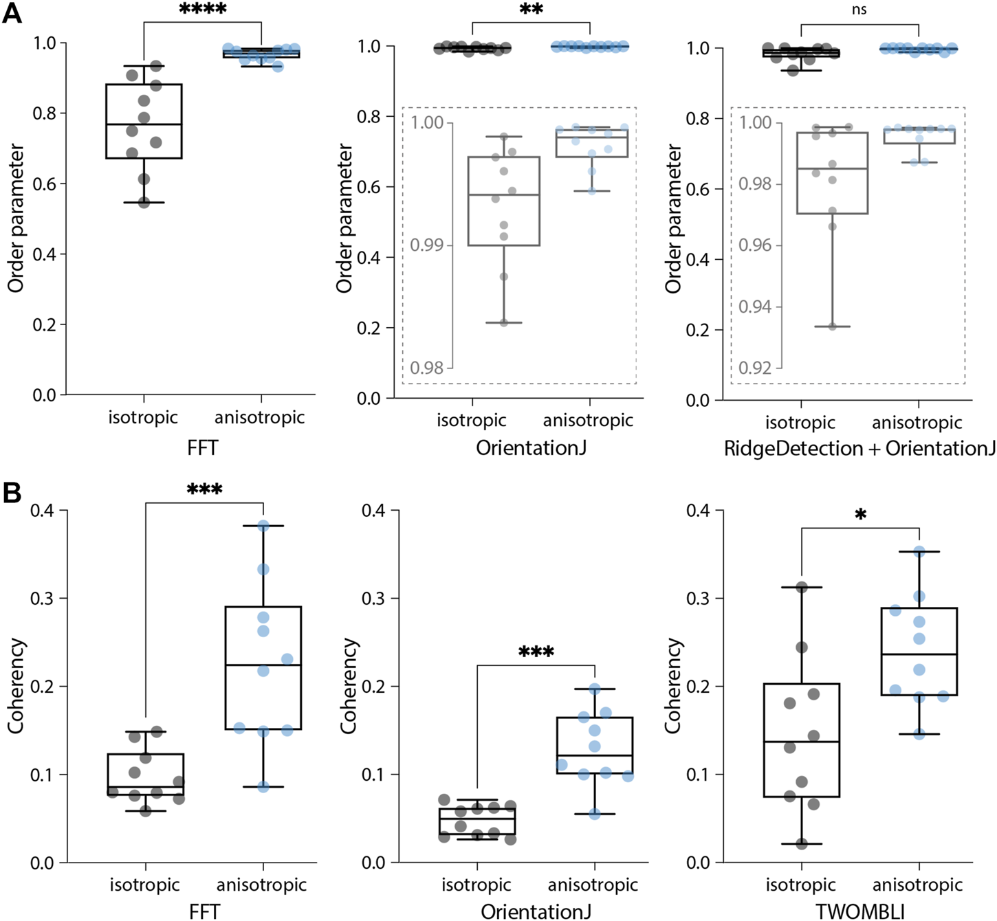 Two alignment metrics were analyzed, the order parameter S (Eq. 6) and the coherency; the first metric is the one used in this work, while the coherency is the standard output of both OrientationJ and TWOMBLI. The comparison dataset contained two samples of images, with isotropic (Figure 9B) and anisotropic (Figure 9A) features. All the tested algorithms were able to recognize the alignment difference in the data, however, the order parameter scores calculated with the TWOMBLI approach (fiber segmentation via Ridge Detection followed by alignment with OrientationJ) did not reach statistical significance (Figure 10A). Moreover, the order parameter values calculated with both OrientationJ and the hybrid approach were very close to the upper limit of the range (values equal to 1 signify perfect alignment). This suggests that these methods might not be reliable in detecting subtle differences between samples, due to their limited ability to resolve local isotropy (Figure 9). Global coherency obtained with the three methods was also compared, showing that all of them could successfully distinguish the global alignment differences in the two samples (Figure 10B).