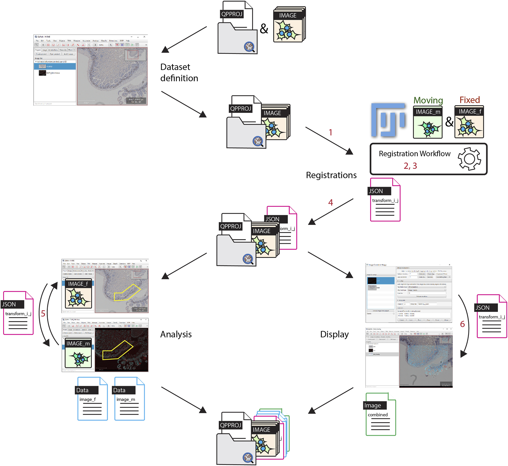 FIGURE 1. Workflow overview. The set of images to be registered are all put into a single QuPath project. Registrations are performed in Fiji, images are opened from a QuPath project and each registration result is stored as a file within the Redundant project entry folder. For the analysis, thanks to the registration result found between two images, regions of interest can be transferred in QuPath from one image to another, in order to generate correlated data. It is additionally possible to create a new combined image within QuPath. Software components implemented for the workflow are labelled in red. 1: opening QuPath project in BigDataViewer; 2: registering workflow in Fiji, 3: bridging Fiji and elastix; 4: Exporting of transformation file; 5: transferring object from one image to another; 6: generation of combined registered images in QuPath.