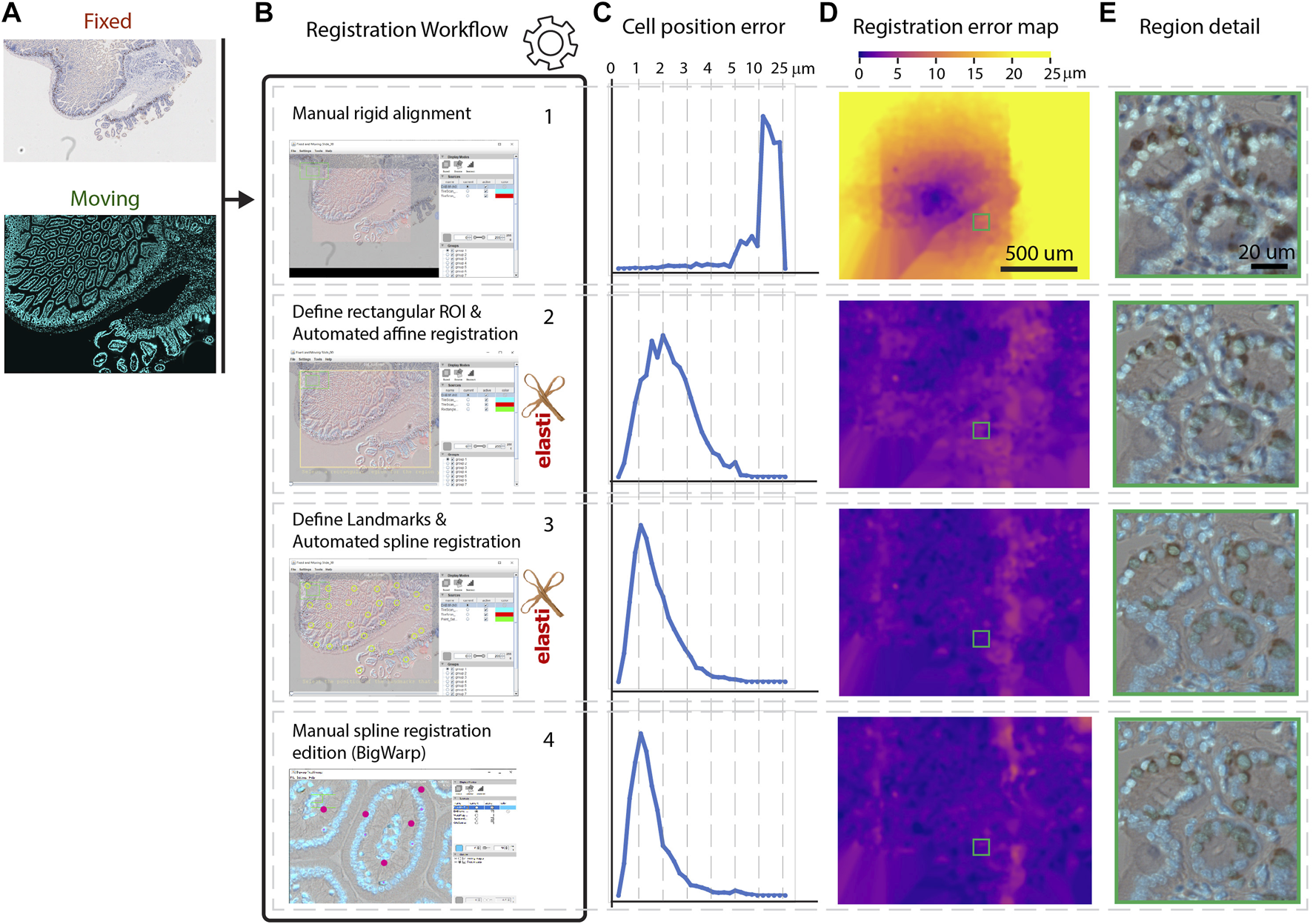 The registration workflow, which happens within Fiji is described in Figures 2A,B. In brief: for each pair of images that needs to be registered, the user has to choose the reference image and then select among 4 (optional) successive registration steps: rigid manual B.1—affine auto B.2—spline auto B.3 (based on landmarks)—spline manual B.4.