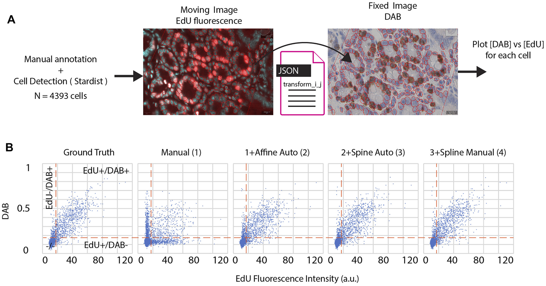 FIGURE 3. (A) The EdU fluorescence image (moving image) is annotated and cells are detected thanks to the DAPI stain within a region of interest. Cells detected in the fluorescence image are transferred to the DAB image (fixed image), using a specific registration result file. Since the transformation is invertible, it would have been possible to segment cells in the DAB image and transfer cells to the fluorescent image.(B). Each cell property for each image can be measured and combined during downstream analysis. Scatter plots of 4,393 detected cells, X: mean fluorescence EdU intensity, Y: mean DAB optical density. Each plot corresponds to a specific transform file, respectively from left to right: - manual annotation of 3,000 + landmarks (ground truth) - manual rigid transformation 1)—manual rigid transformation + automated affine transformation 2)—all steps in 2) + automated spline transformation 3)—all steps in 3) + manual spline transformation 4). Vertical dashed lines: fluorescence threshold (18 a.u.) separating EdU + cells from EdU- cells. Horizontal dashed lines: DAB OD threshold (0.18) separating DAB + cells from DAB- cells.