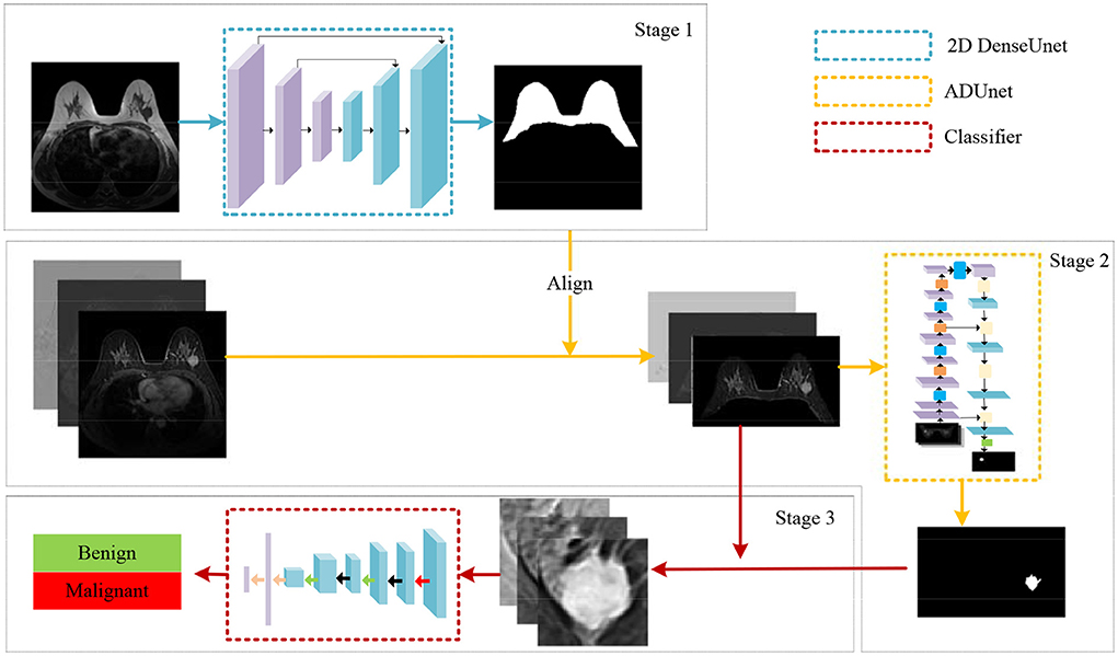 Methods: In proposed algorithm, a DenseUNet is firstly employed to extract breast-related regions by removing irrelevant parts in the thoracic cavity. Then, by taking advantage of the attention mechanism and the focal loss, a novel network named Attention Dense UNet (ADUNet) is designed for the tumor segmentation. Particularly, the focal loss in ADUNet addresses class-imbalance and model overwhelmed problems. Finally, a customized network is developed for the tumor classification. Besides, while most approaches only consider one or two series, the proposed algorithm takes in account multiple series of MRI images.