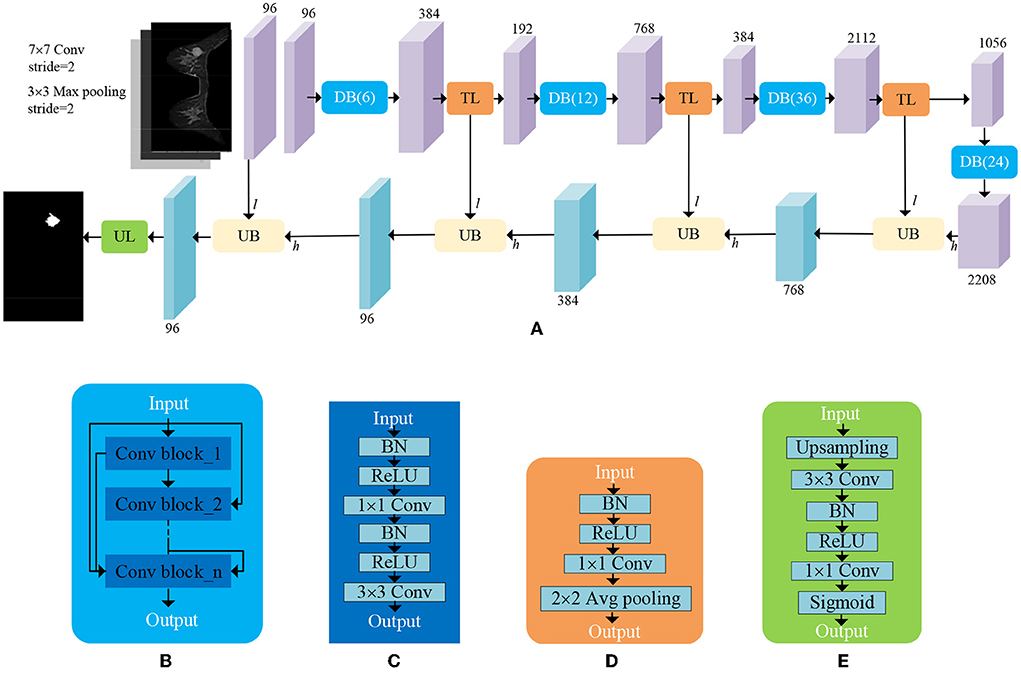 Figure 5. An illustration of ADUNet. (A) The architecture of ADUNet; (B) Dense Block (DB(n)); (C) Convolutional Block; (D) Transition Layer (TL); (E) Upsampling Layer (UL).